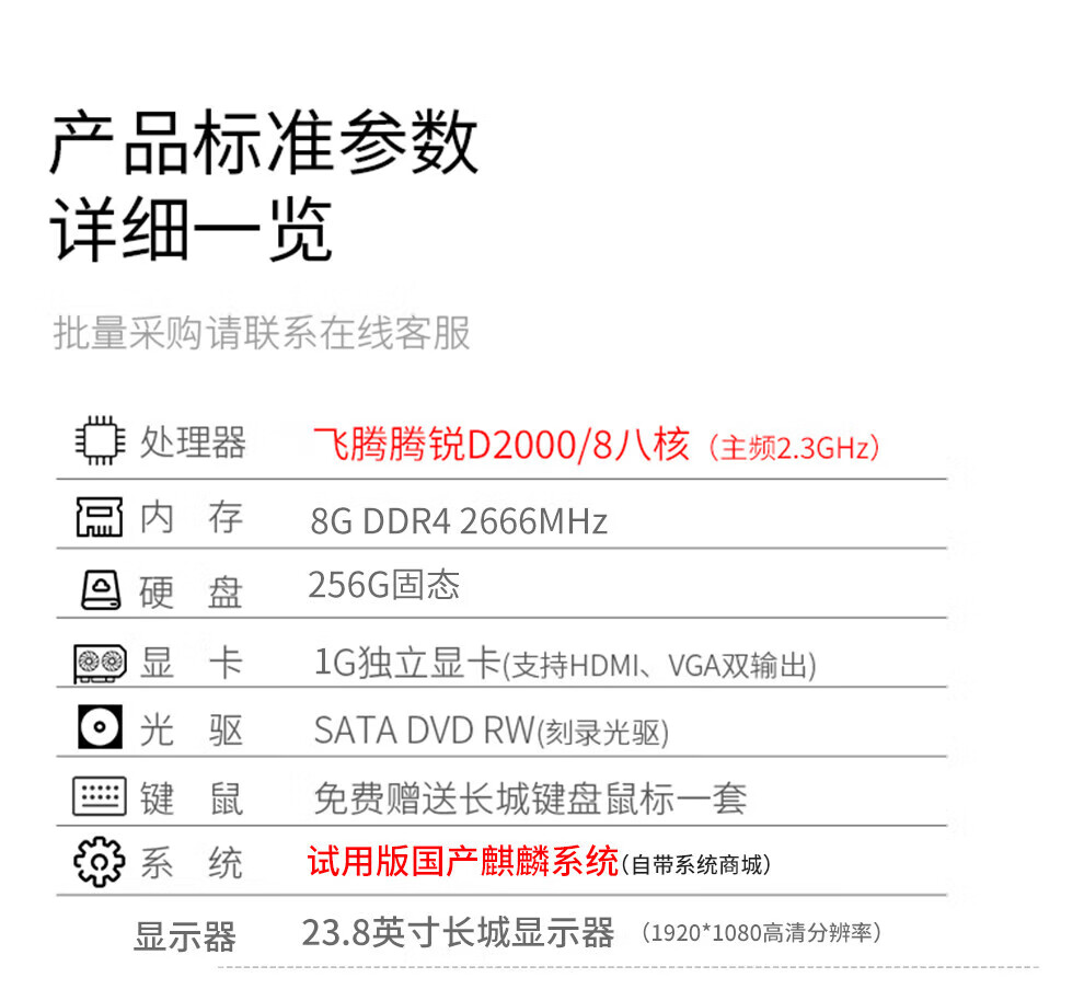 • 商品名称:长城国产台式机 世恒TD120A2 电脑整机(飞腾D2000 16G 512G 2G独显 DVDRW)23.8英寸 麒麟V10/统信V20正版系统 TD120A2/台