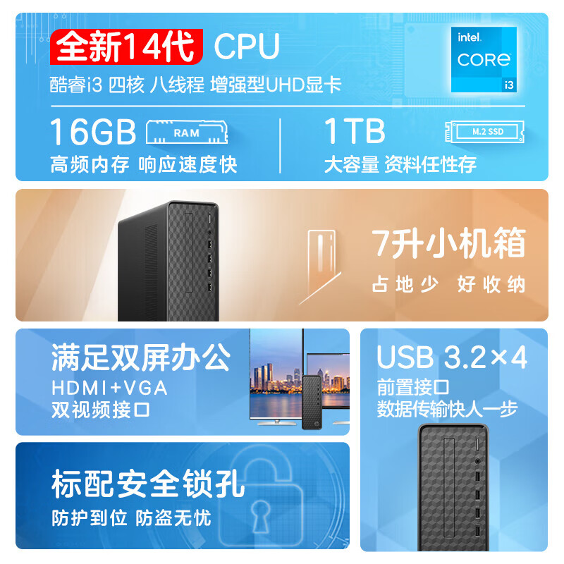 电脑、办公  > 电脑整机  > 台式机  >  惠普/HP  >  惠普(HP)星Box商用台式电脑商务办公台式机 (14代i3-14100 16G 1TBSSD WiFi Office)单主机 N01/台
