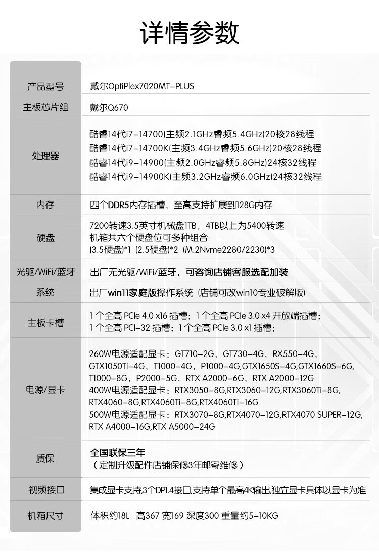 • 商品名称:戴尔OptiPlex 14代i7-14700/16G内存/1TB固态/RTX5060 8G独显/7020MT PLus商用设计图形渲染台式机定制 Optiplex/台