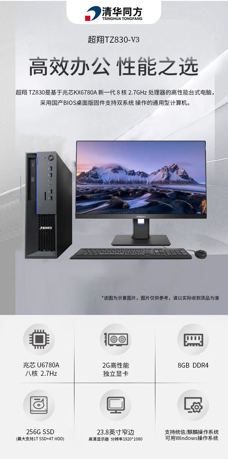 清华同方信创电脑台式机国产化 超翔TZ830台式机 兆芯U6780A 8G 512G 2G独显 麒麟/统信 国产试用 超翔TZ830-V3/台
