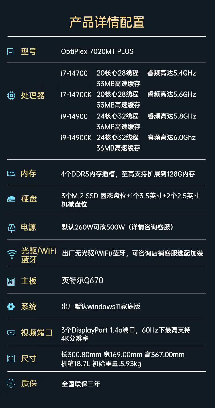 • 商品名称:戴尔(DELL)OptiPlex7020MT PLUS商用台式电脑主机i7-14700/32G/1T/GTX1650-4G+27英寸显示器/wifi定制 戴尔OptiPlex/台