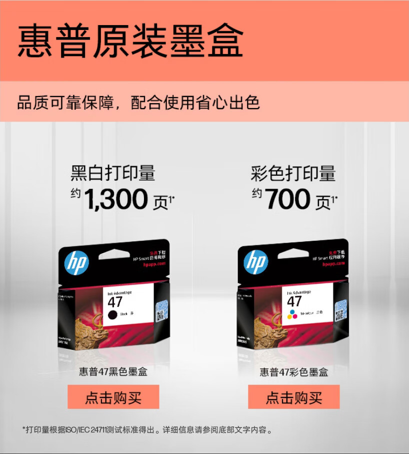 包装清单: HP DeskJet Ink Advantage 4925 打印机;HP 47 初始化黑色墨盒;HP 47 初始化彩色墨盒;法规宣传页;安装指南;参考指南;USB 电缆;电源线