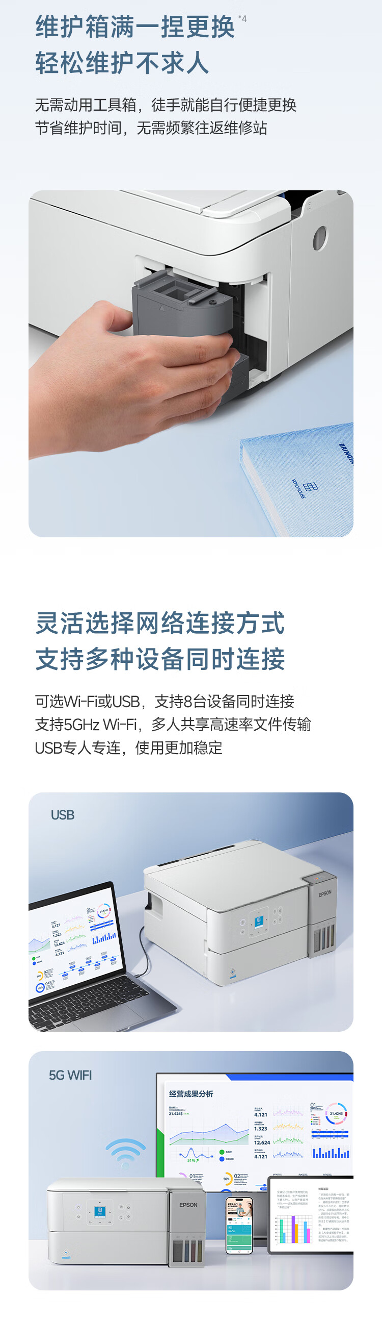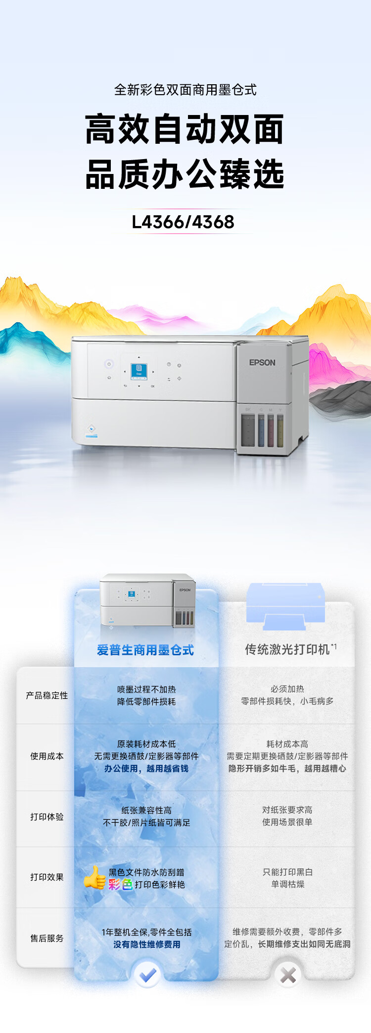 电脑、办公  > 办公设备  > 喷墨打印机  >  爱普生/EPSON  >  爱普生【五年全保 不限次上门维修】墨仓式L4366 彩色办公印量升级 双面打印/复印/扫描 wifi5G/手机 L4366/件