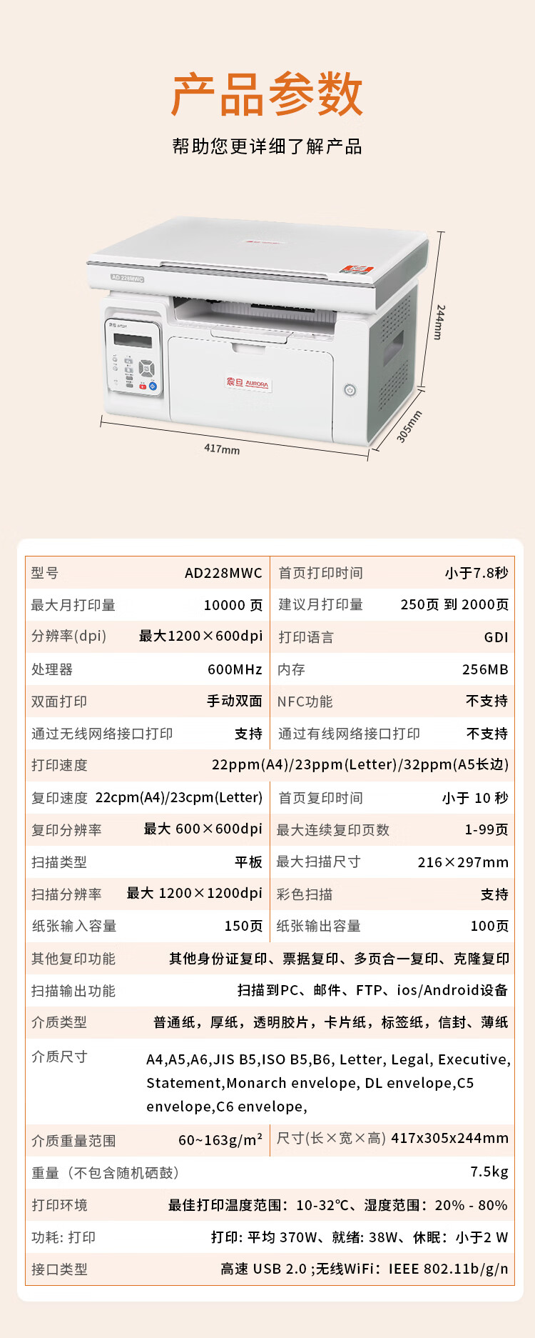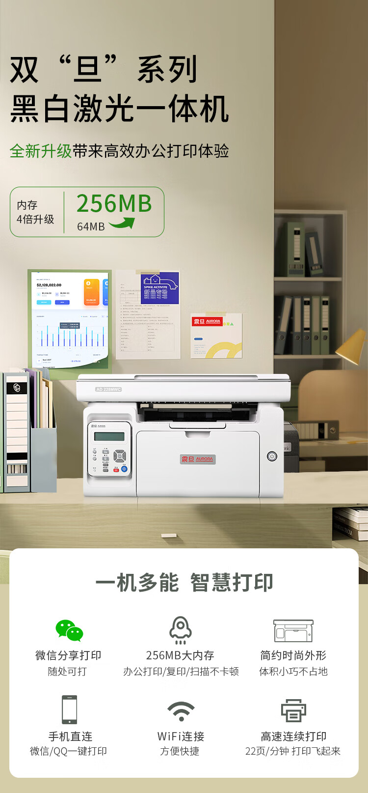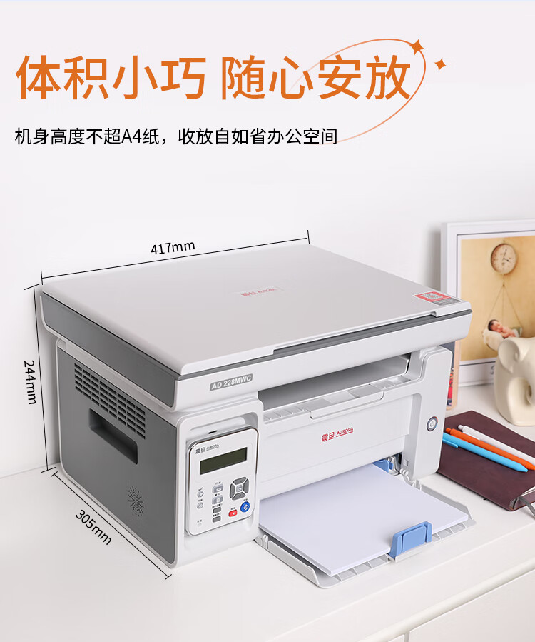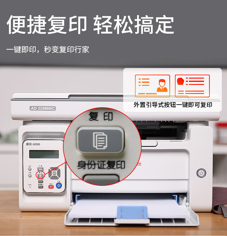 • 商品名称:震旦(AURORA) AD228MWC A4黑白激光无线打印机家用办公打印复印扫描一体机学生家庭作业打印 AD228MWC/台