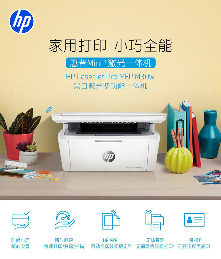 • 商品名称:惠普(HP)Mini M30w 黑白激光打印机学生家用无线多功能一体机 ( 体积小巧 、复印、扫描) LaserJet Pro MFP M30w/台