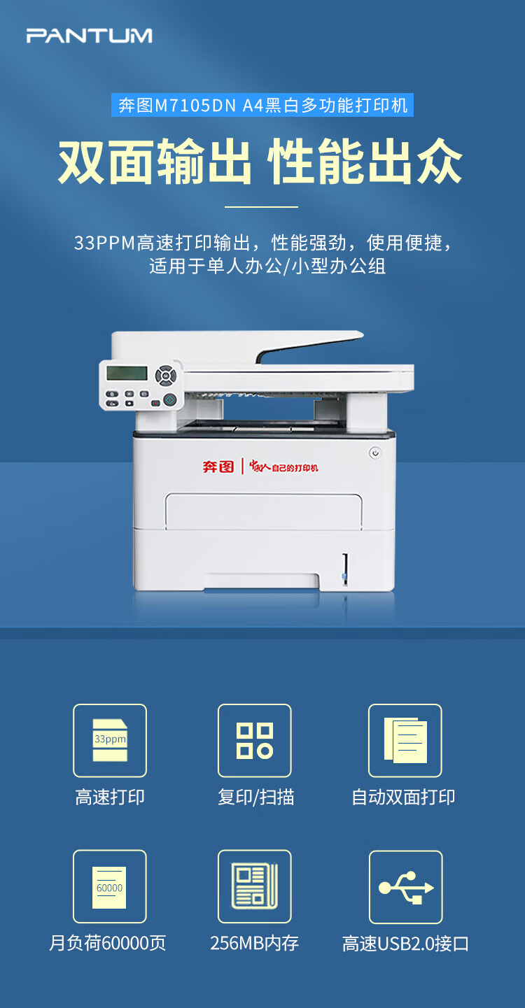 商品名称: 奔图(PANTUM)M7105DN A4黑白激光多功能打印机 自动双面打印 网络打印 33页/分钟 国产信创/ M7105DN/台