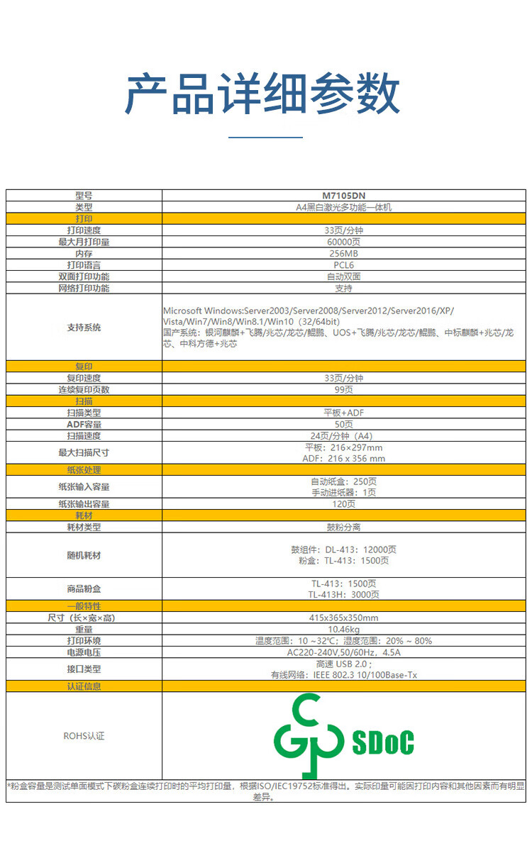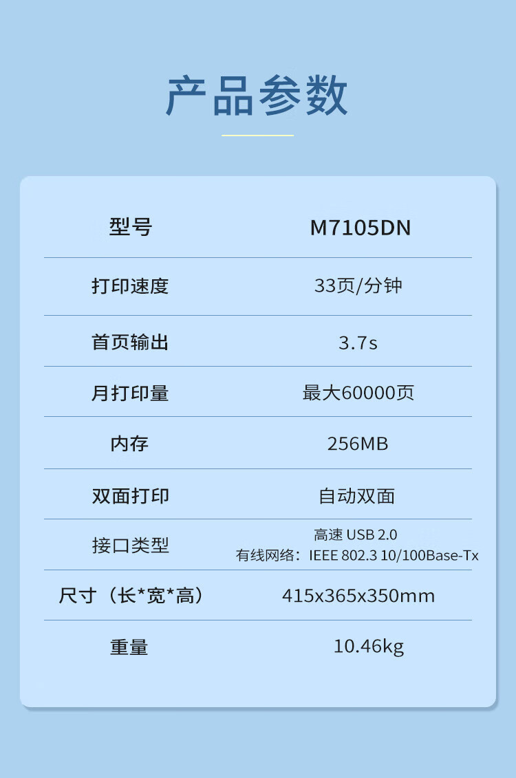 • 商品名称:奔图(PANTUM)M7105DN A4黑白激光多功能打印机 自动双面打印 网络打印 33页/分钟 国产信创/ M7105DN/台