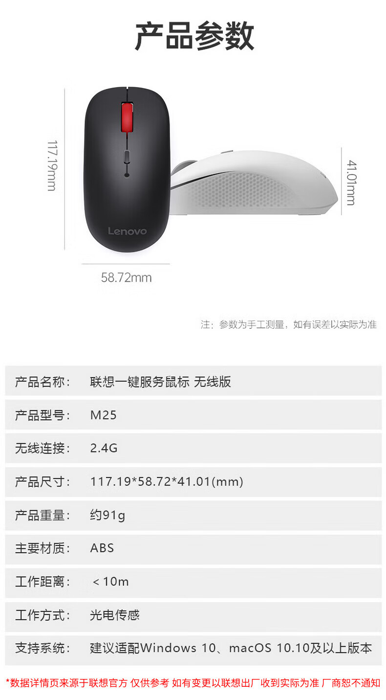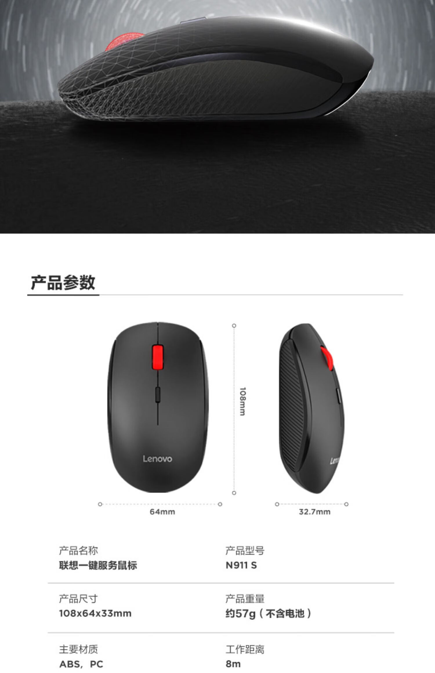 商品名称: 联想(Lenovo)无线静音一键服务鼠标 静音按键 经久耐用 可调节DPI N911S 黑色 M26/个