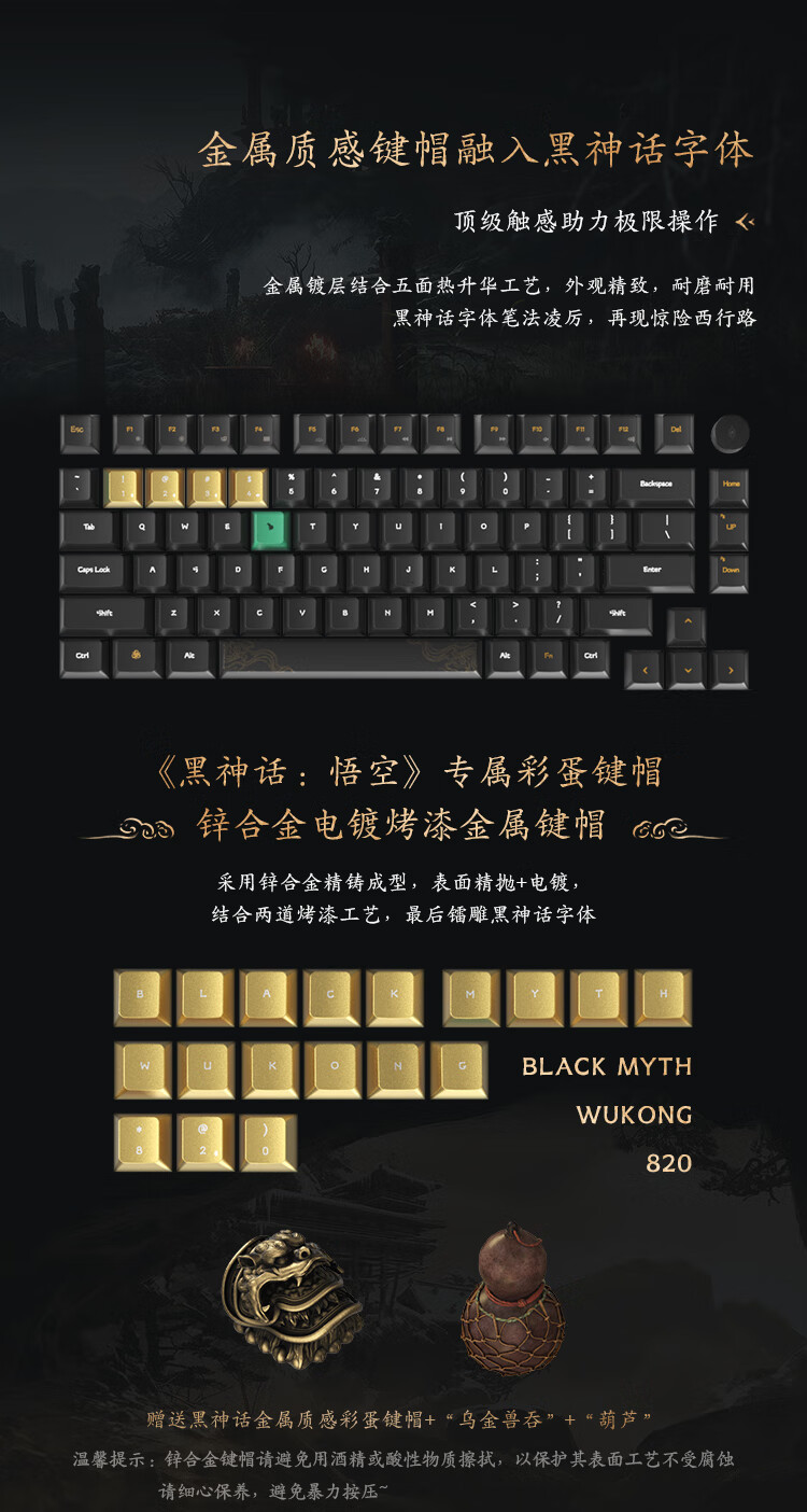 包装清单: <p>键盘*1、“BLACK MYTH WUKONG”纪念金属键帽、“820”纪念金属键帽、“乌金吞兽”黄铜键帽、“葫芦”旋钮、充电线*1、接收器*1、拔键拔轴器*1、替换轴体*2</p>