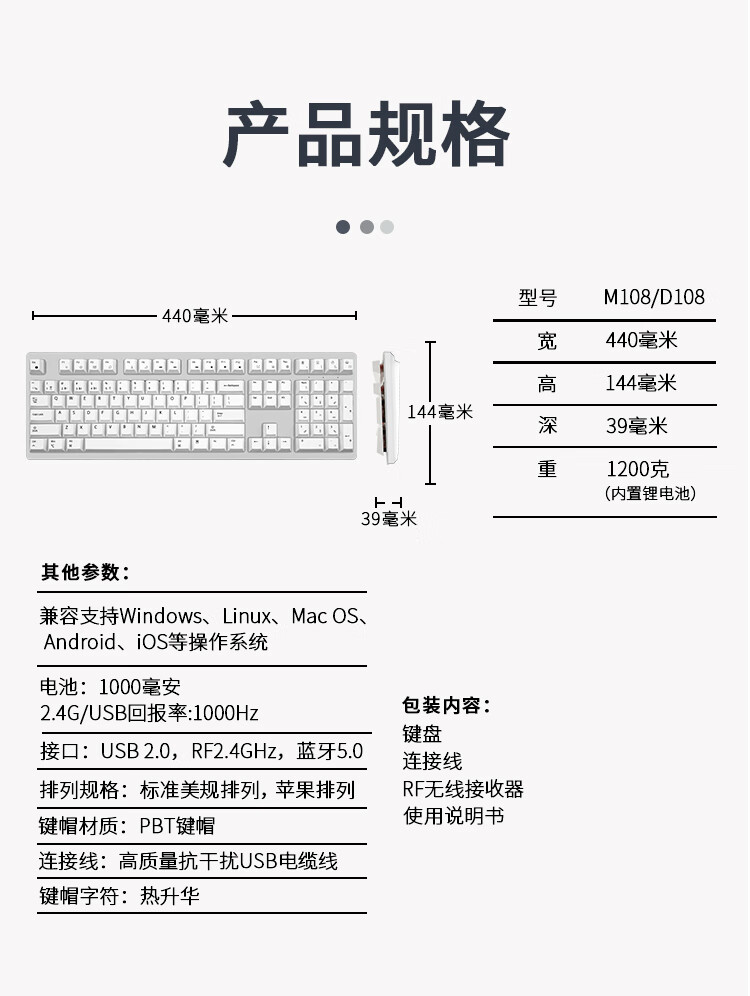 包装清单: USB线 × 1、接收器 × 1、键盘 × 1、说明书 × 1