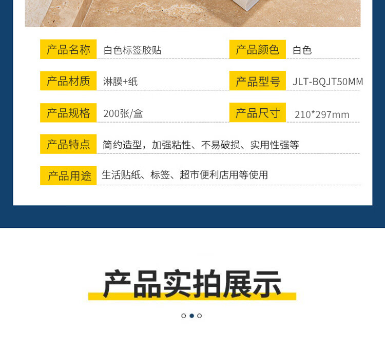 商品名称: 京狼途JLT-BQJT50MM 便签胶贴 不干胶标签210mm*297mm (200/张/盒) JLT-BQJT50MM/盒