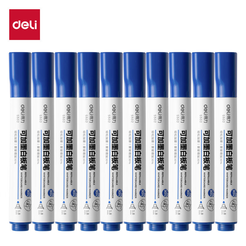 电脑、办公  > 文具  > 笔类  >  得力/deli  >  得力白板笔可加墨水可擦白板专用笔红蓝黑色加墨水性可加墨白板 S502蓝色可加墨白板笔10支装 S502/个