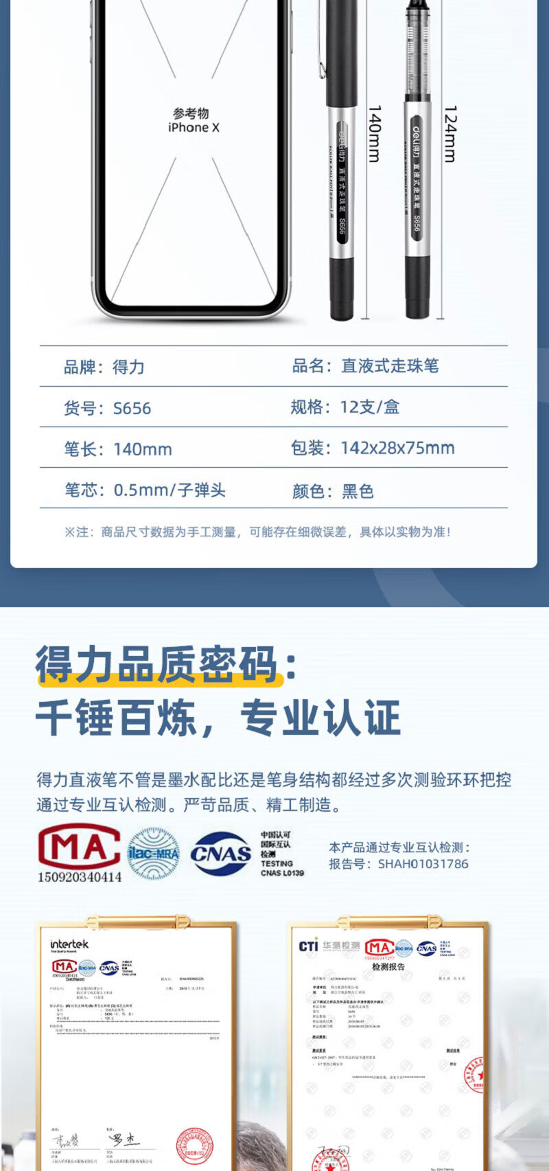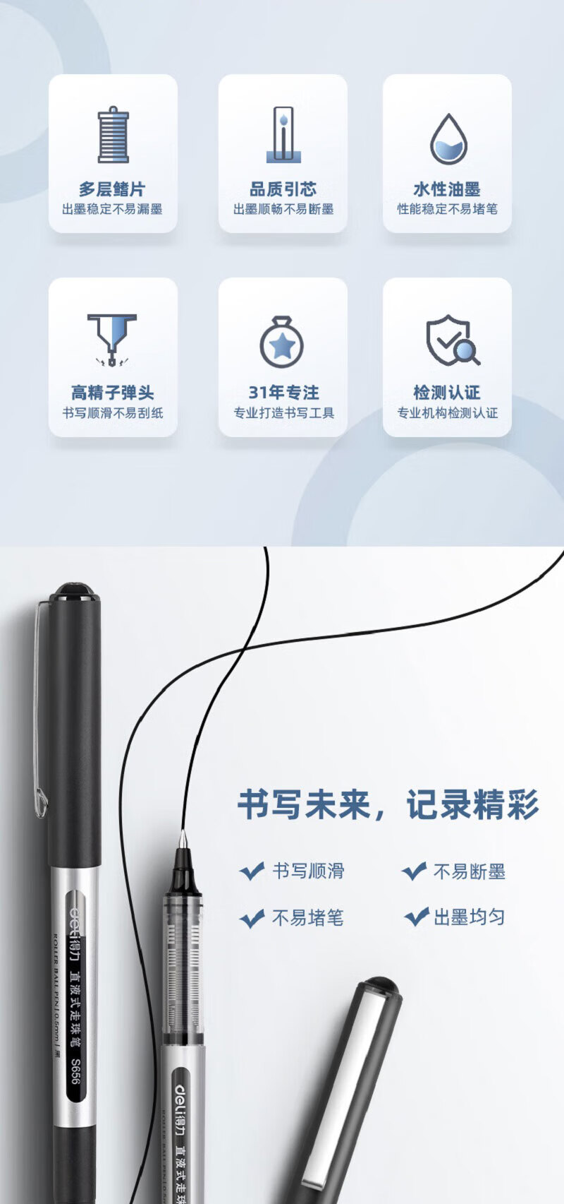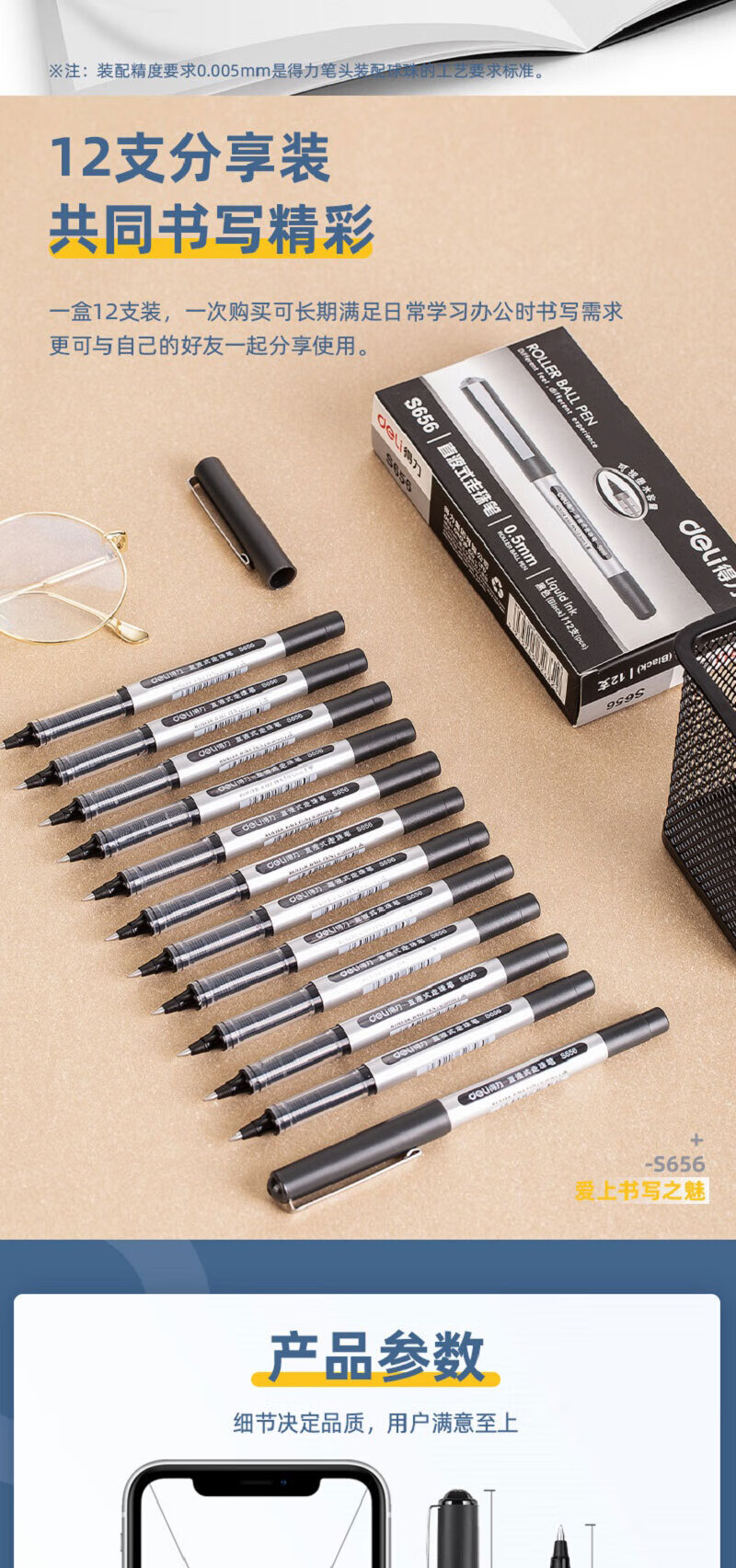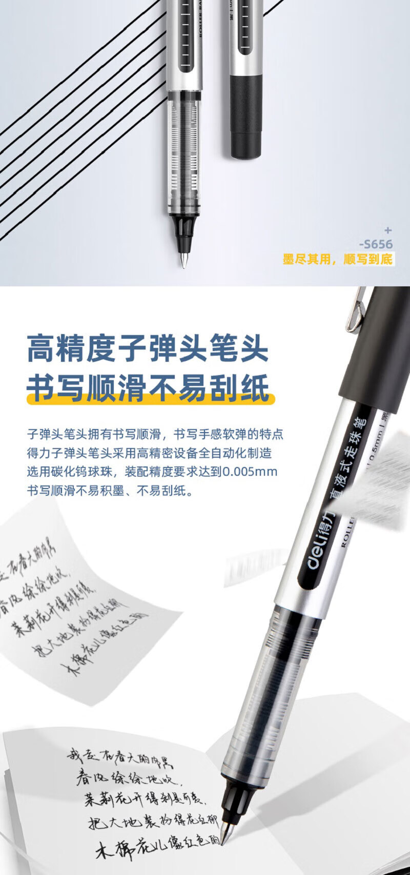 • 商品名称:得力S656 直液式走珠签字笔 子弹头水性笔 0.5mm商务办公用经典黑色中性笔 3盒装 12支/盒 S656 /个