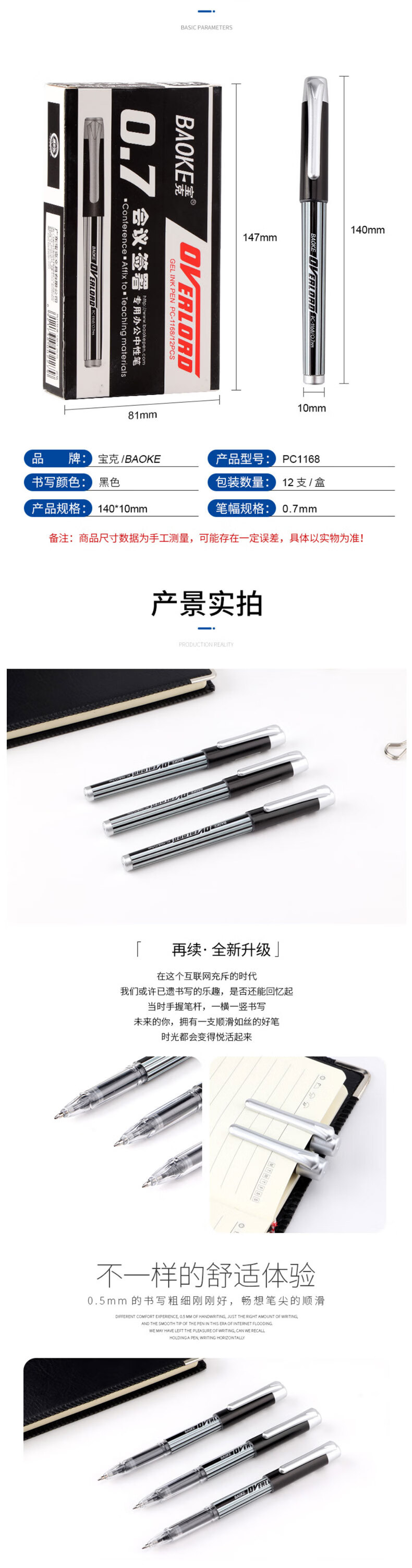 • 商品名称:宝克(BAOKE)PC1168中性笔黑笔签字笔水笔大容量0.7mm会议记录笔 12支/盒 PC1168/盒