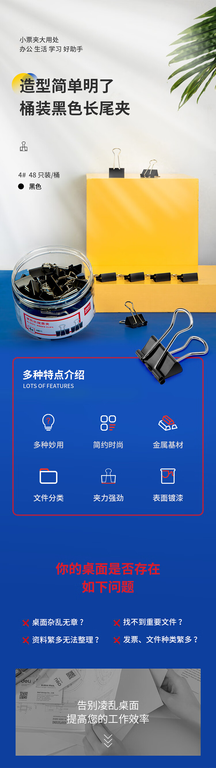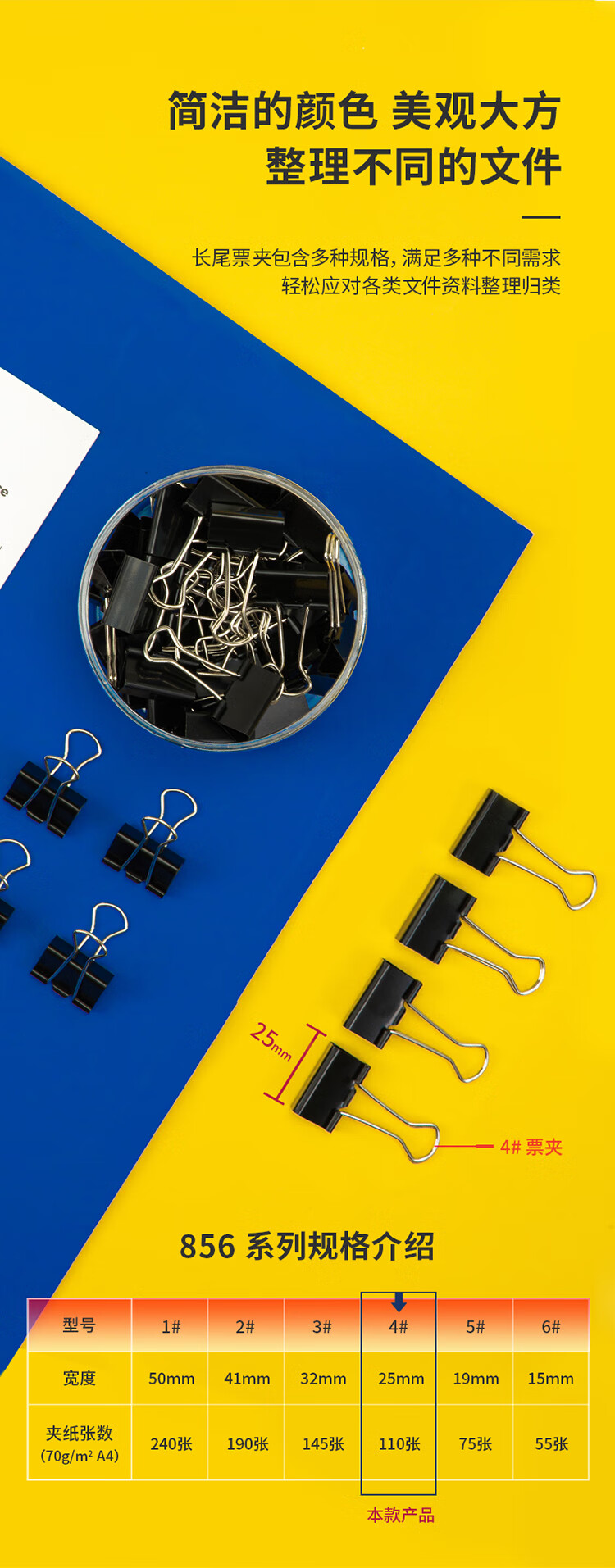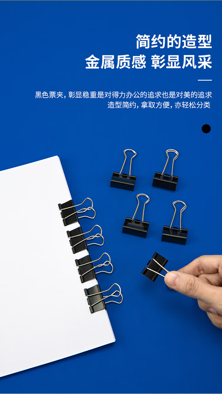• 商品名称:得力(deli)48只25mm黑色长尾夹票夹 4#中号金属燕尾夹票据文件夹子 办公用品 48只/筒 8564 DL8564/筒