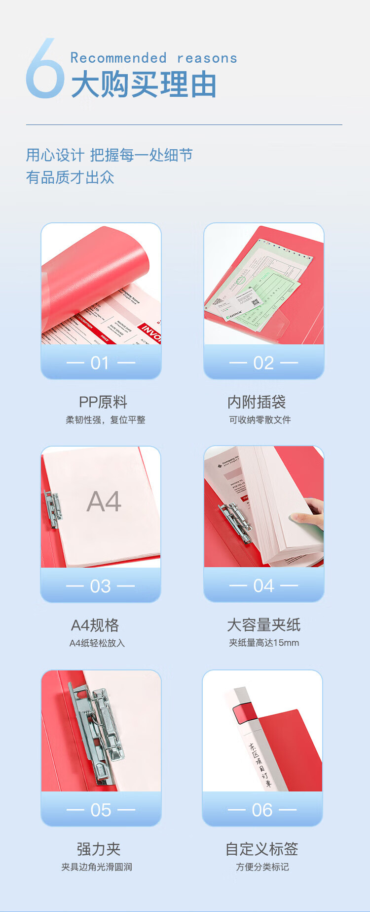 包装清单: 文件夹 单强力夹+插袋 红色 5个装*1