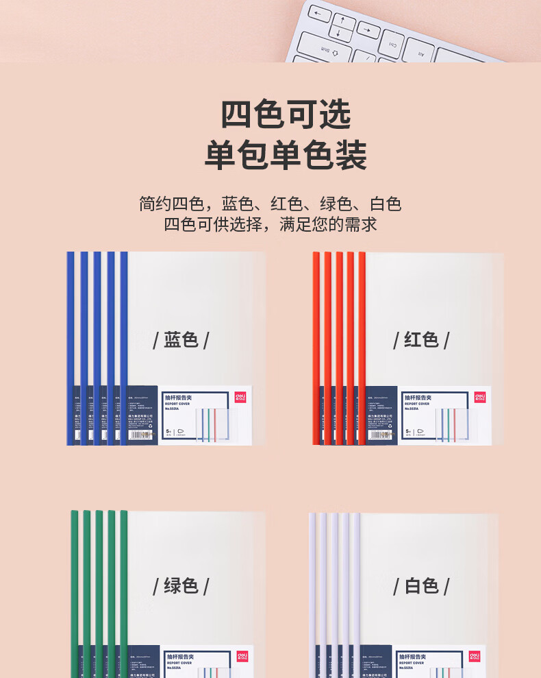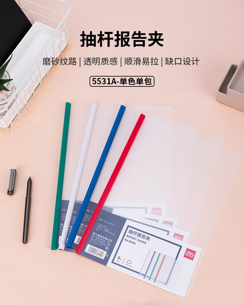 得力 得力(deli) 拉杆夹文件夹 背宽彩色抽杆夹报告夹 学生考试收纳 得力5531A_抽杆报告夹(混)(5个/包)*1 5531A/包