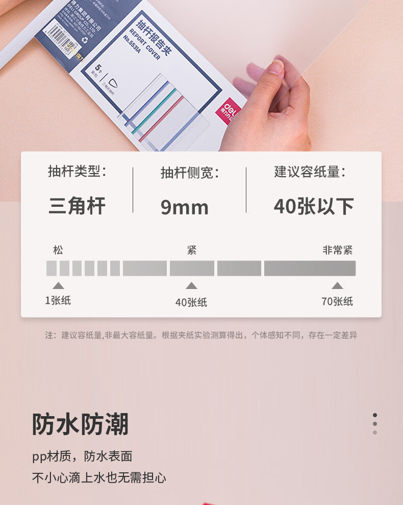 商品名称: 得力 得力(deli) 拉杆夹文件夹 背宽彩色抽杆夹报告夹 学生考试收纳 得力5531A_抽杆报告夹(混)(5个/包)*1 5531A/包