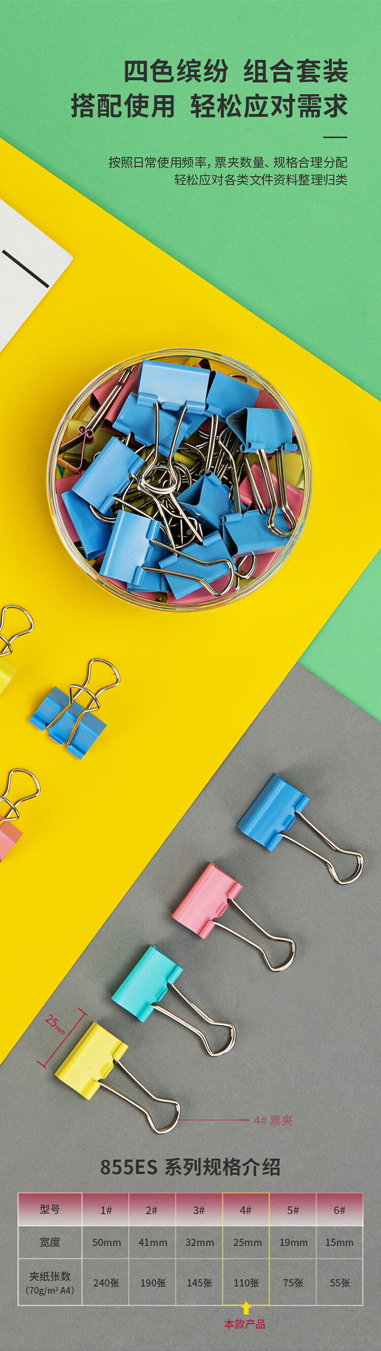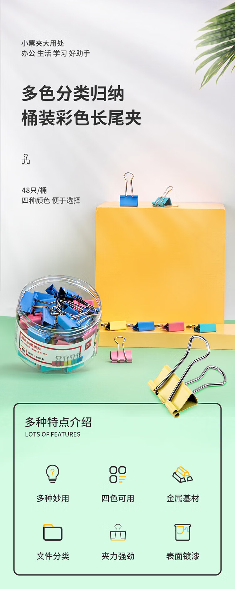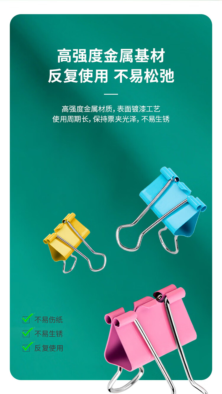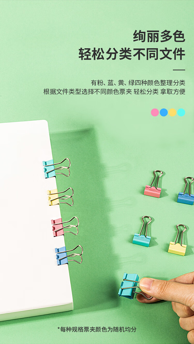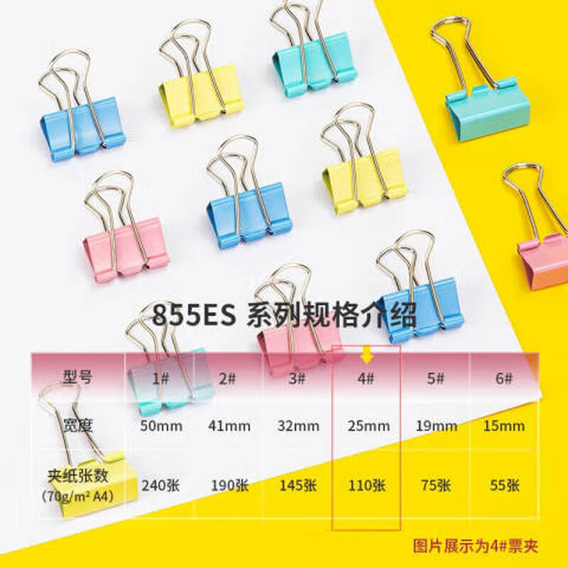 • 商品名称:得力 8554ES 彩色长尾夹票夹 4#中号25mm 金属燕尾夹票据文件夹办公 48只/筒 8554ES /筒