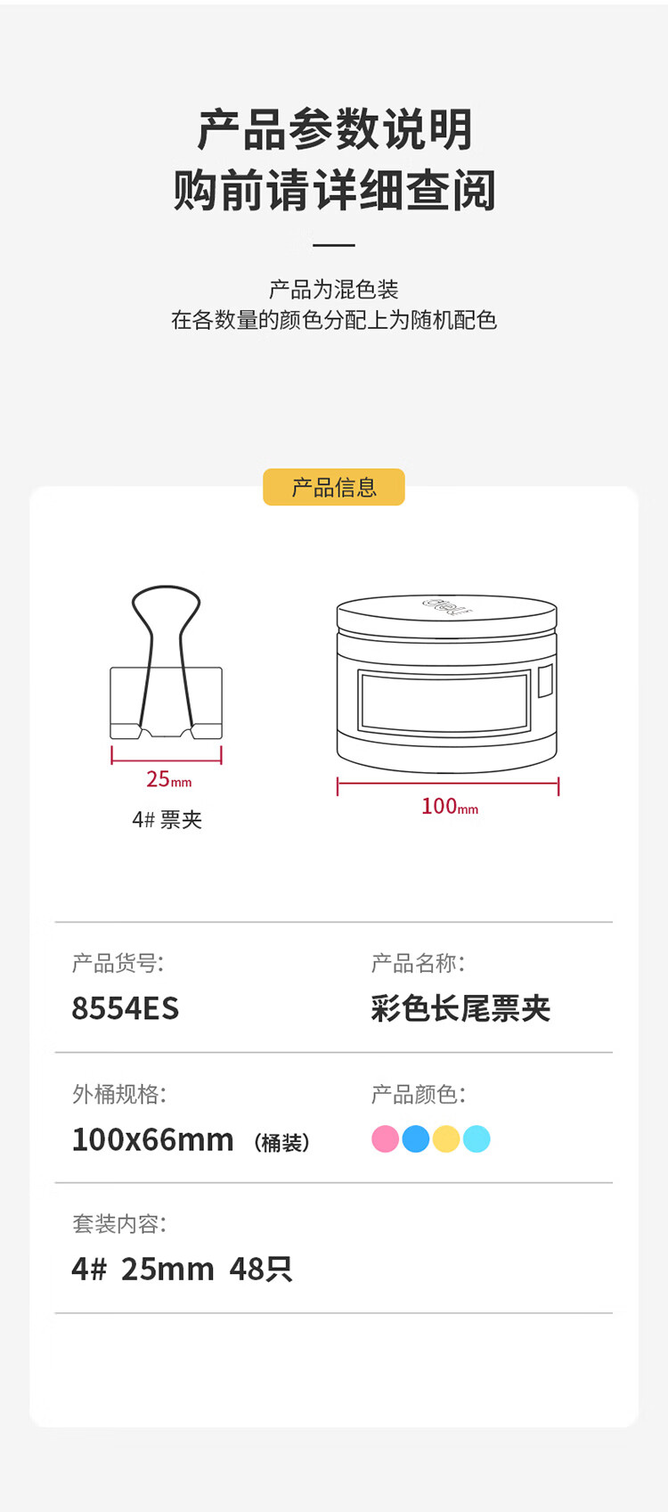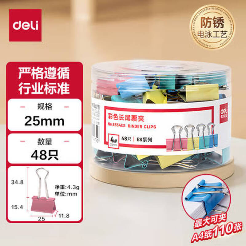 商品名称: 得力 8554ES 彩色长尾夹票夹 4#中号25mm 金属燕尾夹票据文件夹办公 48只/筒 8554ES /筒