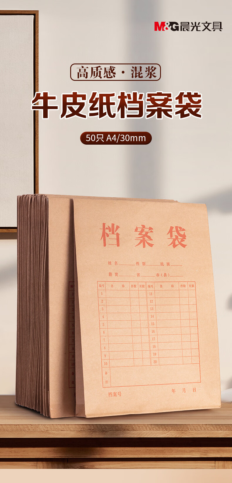 • 商品名称:晨光(M&G)文具50个装A4/150g牛皮纸档案袋 大容量文件袋资料袋 标书合同文件整理收纳袋ADM945N2 ADM945N2/套