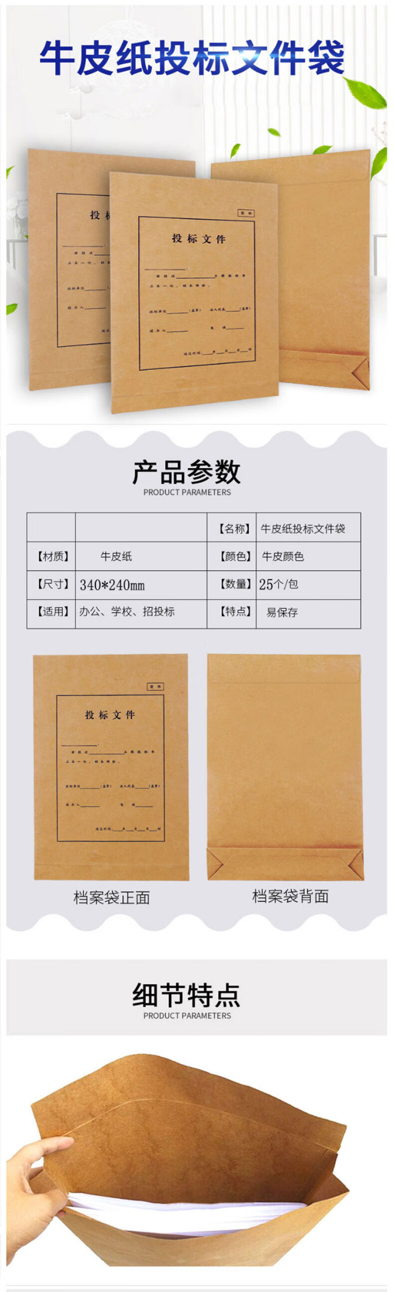 • 商品名称:Homeglen A4投标文件袋 牛皮纸加厚标书袋 档案袋 资料袋 办公用品侧宽15cm 25个装 档案袋/包