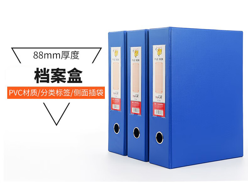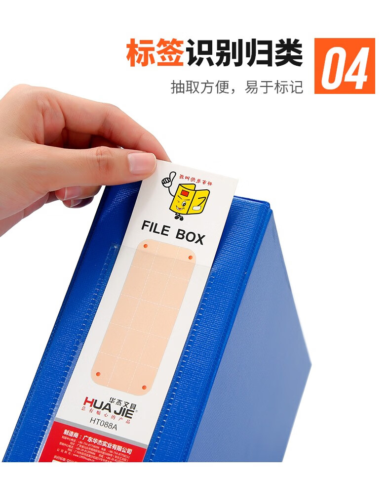 • 商品名称:华杰(HUA JIE)A4档案盒88mm大号资料收纳盒加厚财务凭证收纳盒办公用品(顶夹 15个/箱)HT088A HT088A/箱