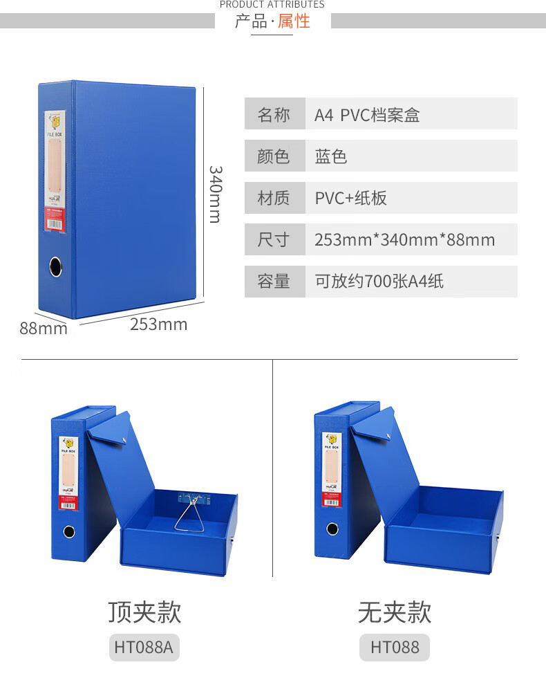 商品名称: 华杰(HUA JIE)A4档案盒88mm大号资料收纳盒加厚财务凭证收纳盒办公用品(顶夹 15个/箱)HT088A HT088A/箱