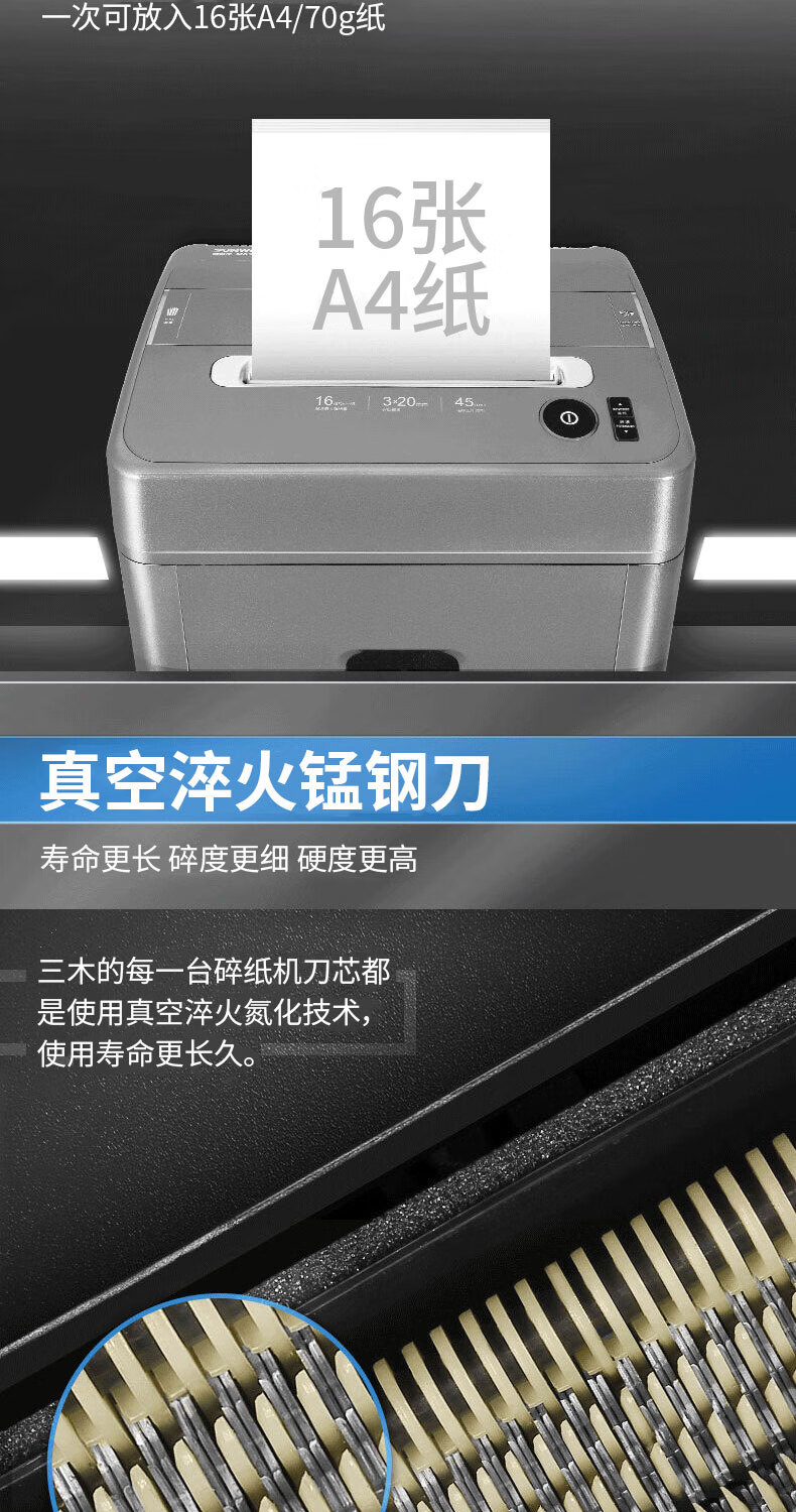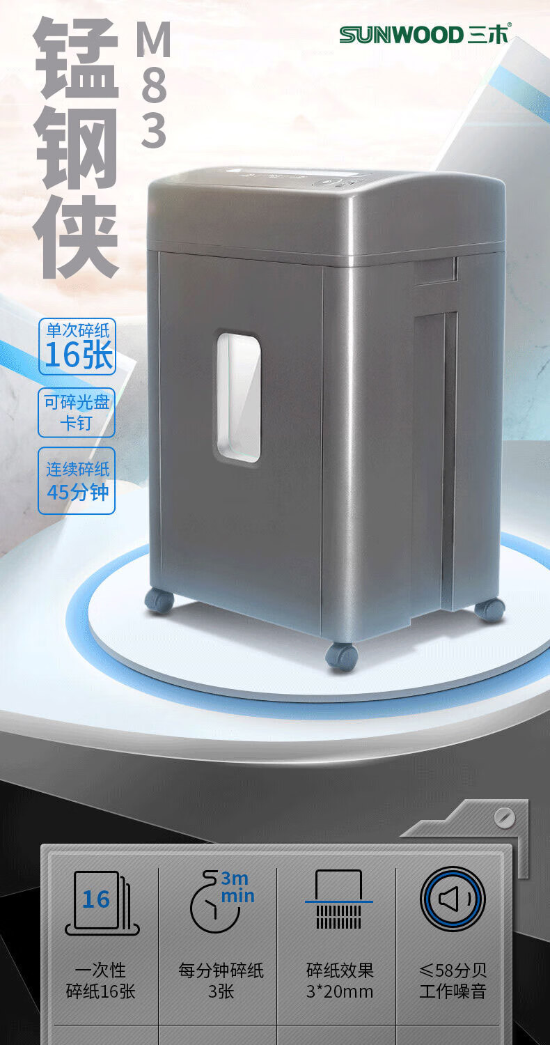 电脑、办公  > 办公设备  > 碎纸机  >  三木/SUNWOOD  >  三木(SUNWOOD)M系列碎纸机 4级保密 双入口(单次16张 持续45分钟 25L 可碎卡,光盘,纸,针)M83 厂家直发 M83/台