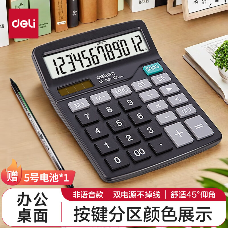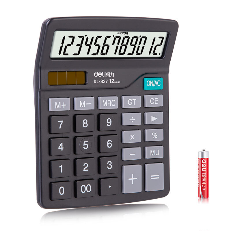 商品名称: 得力(deli)【超级爆款】双电源轻便桌面计算器 12位大屏桌面计算机 办公文具用品 黑色837 通用型桌面计算器-837/件