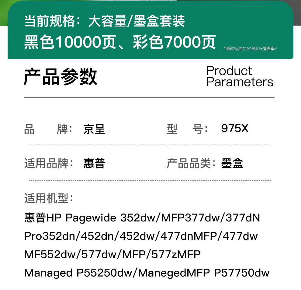 商品名称: 京呈 975A墨盒四色套装大容量适用惠普hp577dw/z 477dn MFP 552dw打印机377dwPro352 X452DN 452DW 墨盒 适用于惠普975A墨盒/个