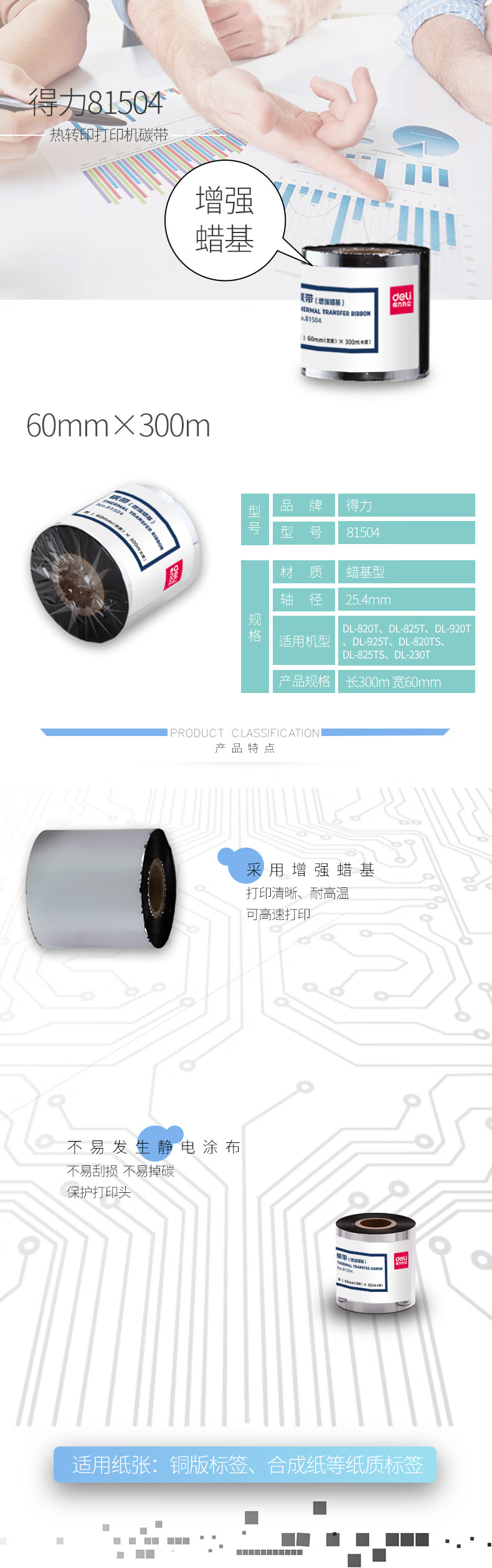 • 商品名称:得力(deli)60mm*300m热转印条码打印机 标签机打印碳带 通用型增强蜡基碳带81504(单支装) 81504/支