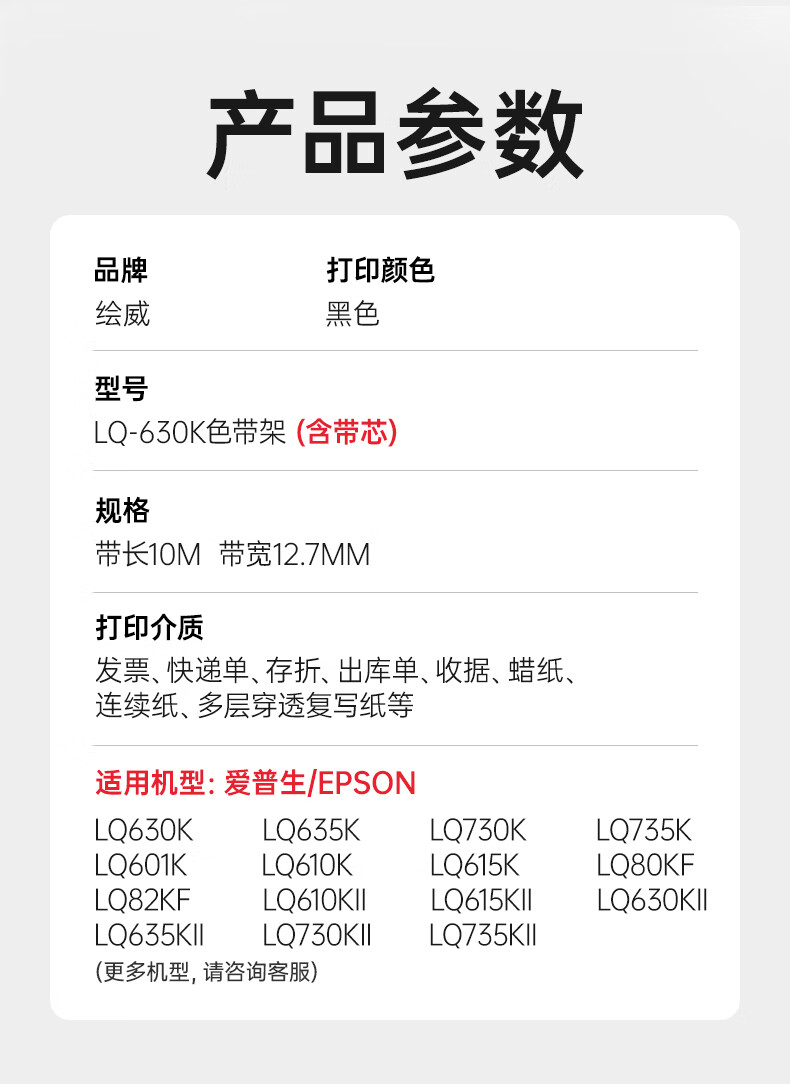 • 商品名称:绘威LQ630K/LQ730K色带架4支装 适用爱普生EPSON LQ630KII LQ635K LQ730K LQ735KII LQ80KF打印机 LQ-630K黑色色带四支装/套