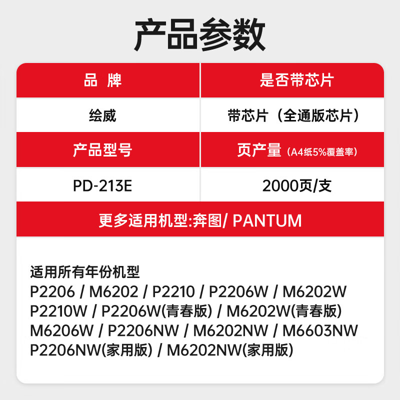 电脑、办公  > 办公耗材  > 硒鼓  >  绘威  >  绘威适用奔图m6202w硒鼓青春版 pd213e硒鼓 p2206w粉盒 P2210W m6202nw p2206nw PD-213 PANTUM奔腾打印机墨盒 硒鼓/支
