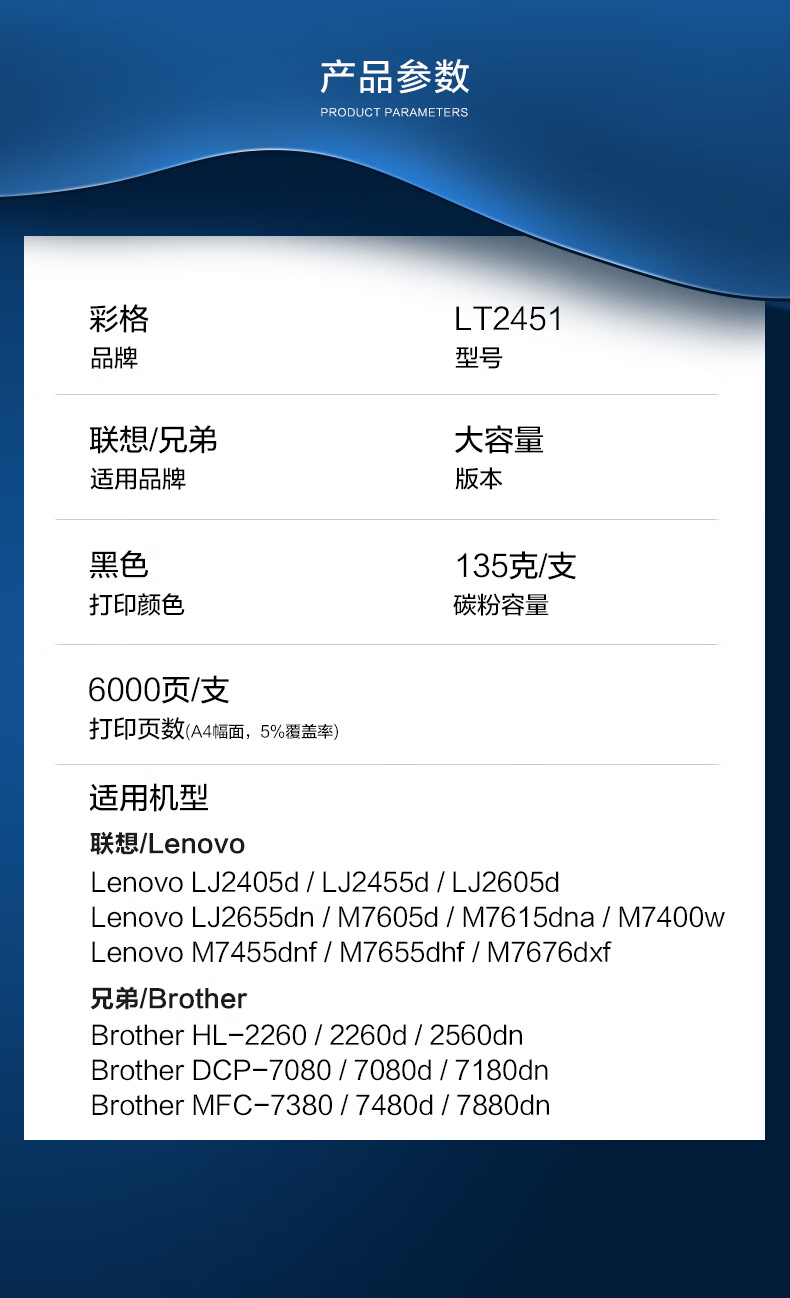 • 商品名称:彩格适用联想m7400pro粉盒m7605d硒鼓lt2451h墨盒m7450fpro m7615dna lj2405d 2605d 2655dn m7675 7655 7455 LT2451H/支