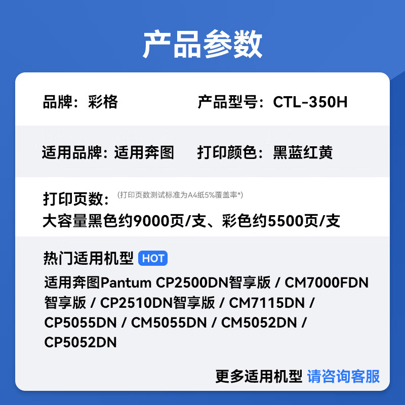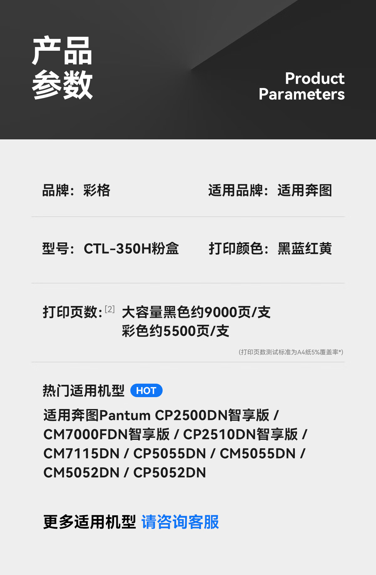 • 商品名称:彩格CTL350H粉盒四色套装适用奔图CP5055DN CM5055DN粉盒CM7000PDN智享版CP2510DN 2500DN墨盒CM7115DN打印机硒鼓 CTL-350HK/CTL-350HC/CTL-350HY/CTL-350HM/支