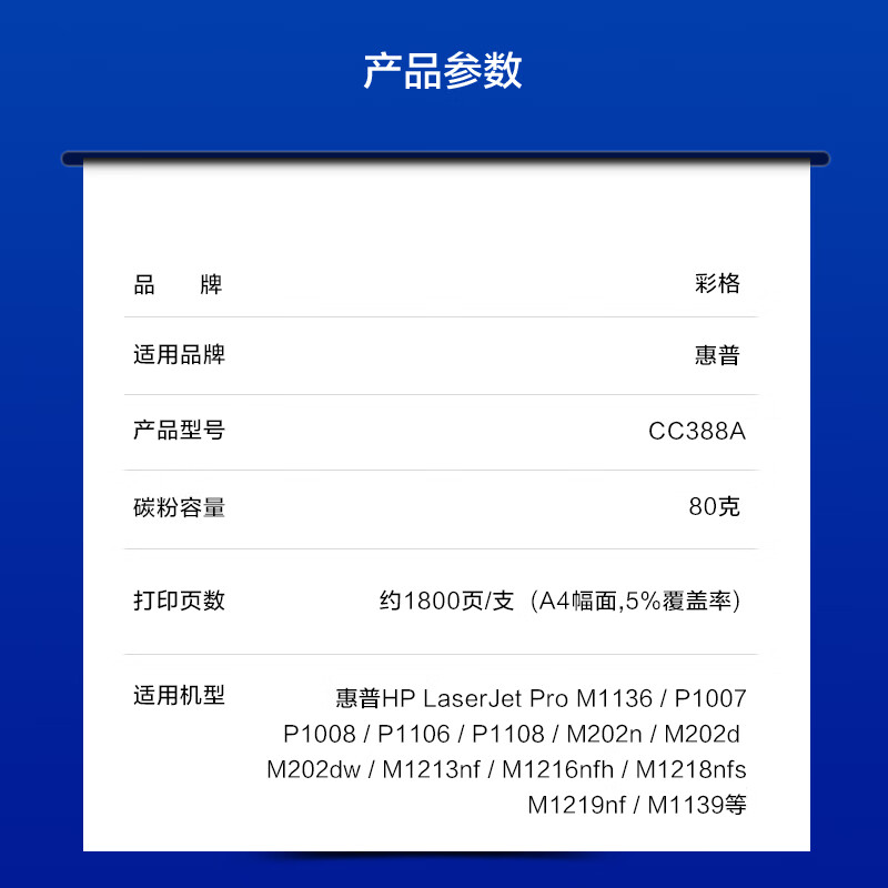 • 商品名称:彩格cc388a碳粉适用惠普hp m1136墨粉88a m126a p1106 p1108 p1007 m1213 m1216 m202n m128fn打印机碳粉墨粉 HP88A碳粉6支装/瓶