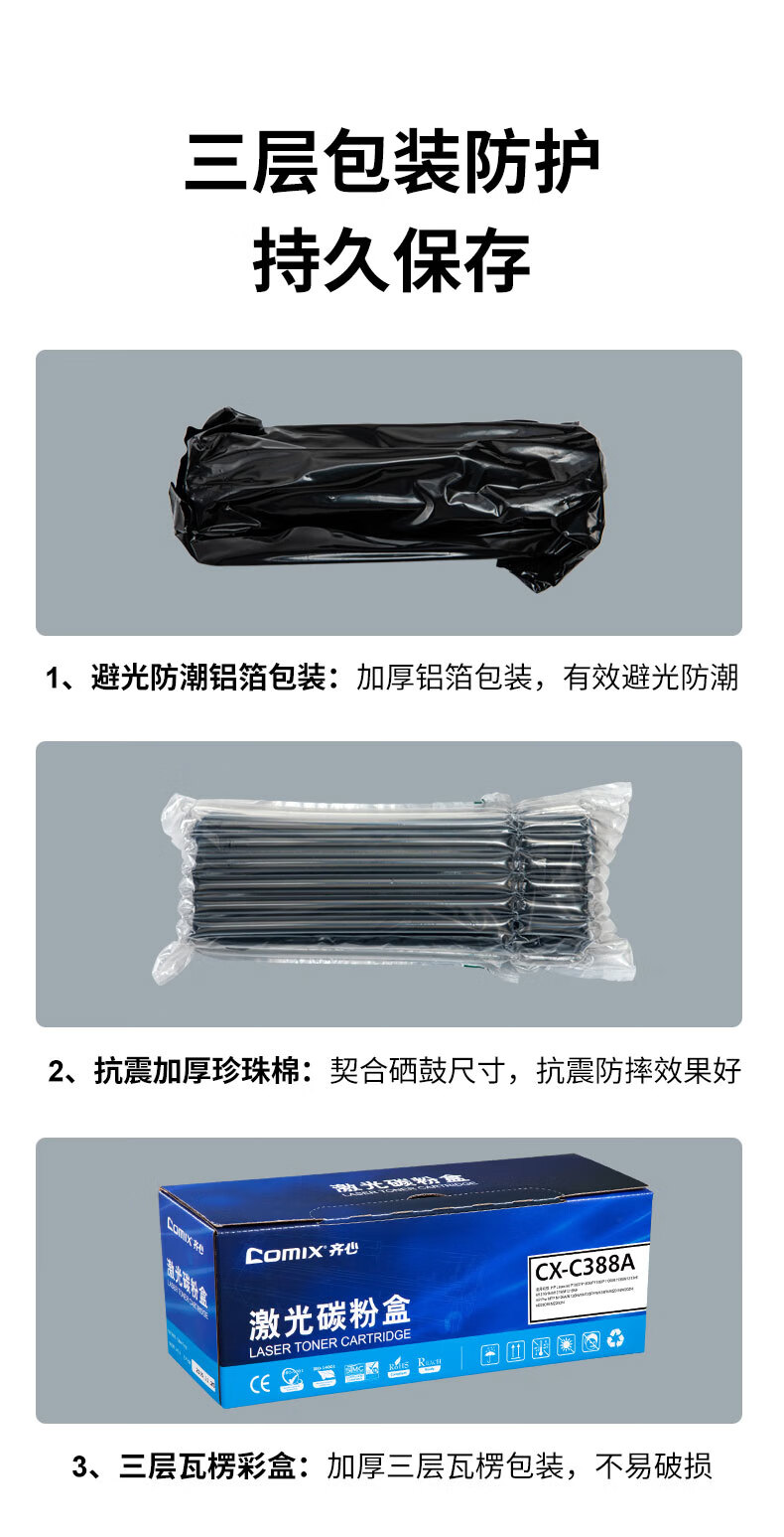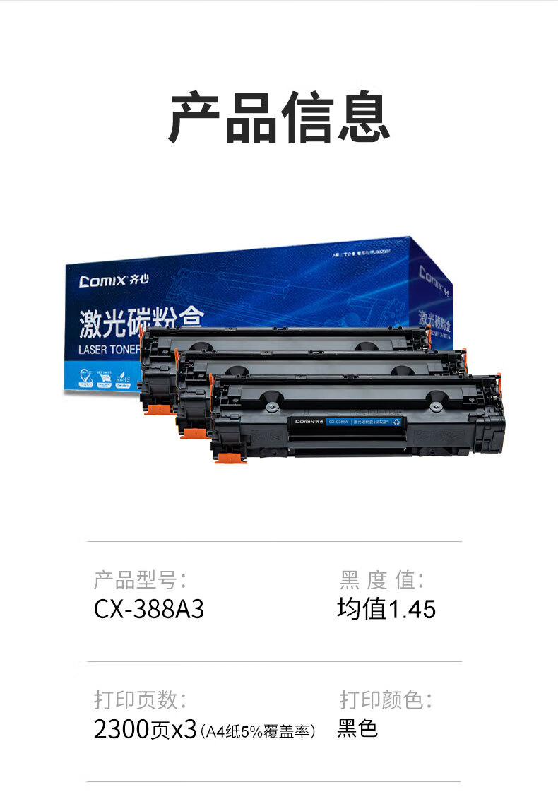 • 商品名称:齐心(COMIX)388A硒鼓3只惠普M1136硒鼓碳粉盒 适用适用打印件HP P1007 P1106 M1213nf M1216nfh墨粉盒 CX-C388A3/个