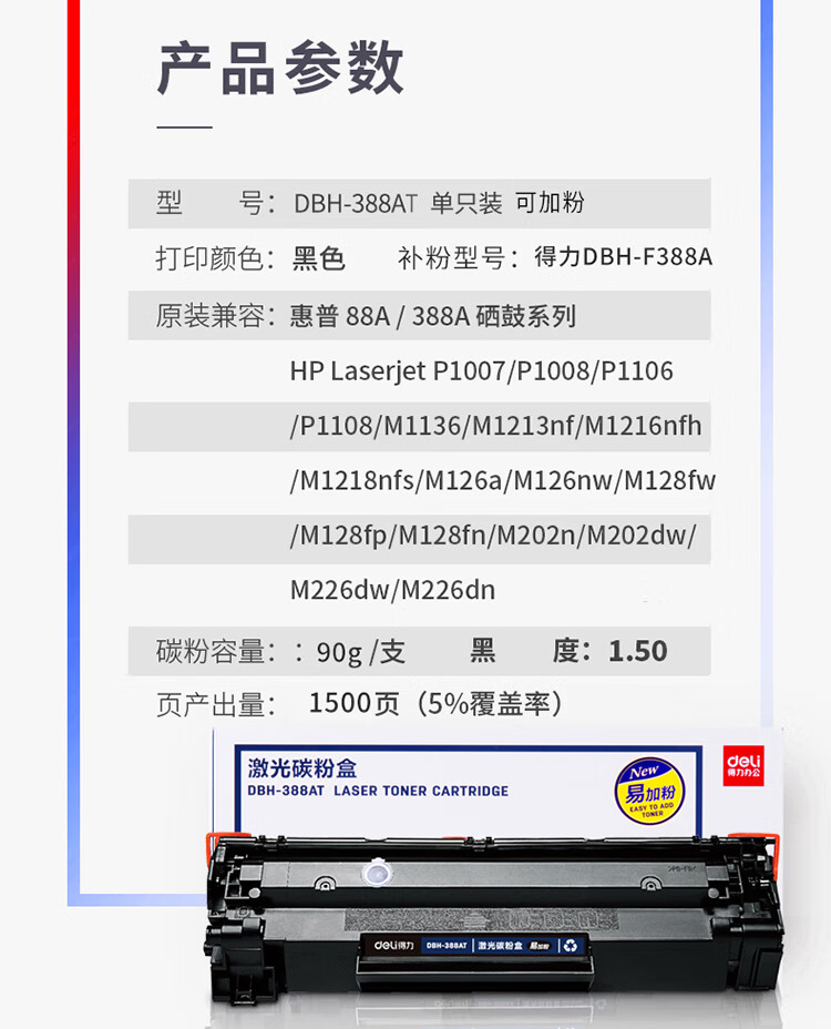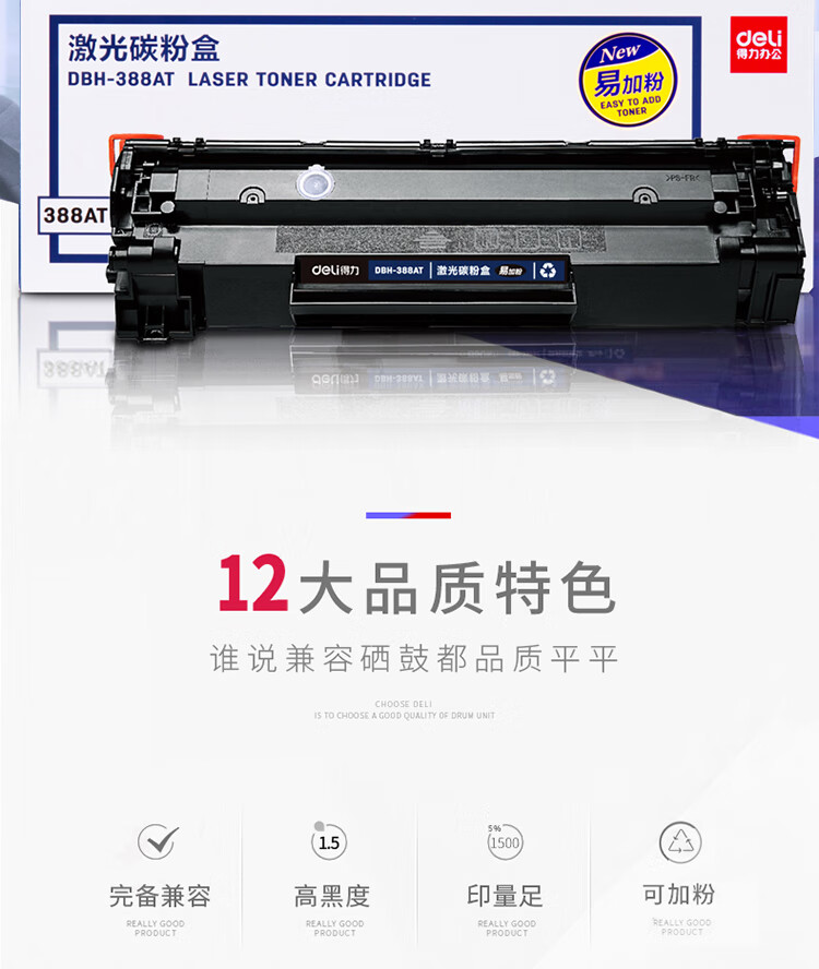 商品名称: 得力(deli)388AT易加粉硒鼓 88A打印机硒鼓 适用于惠普HP P1008 P1106 P1108 M1136 M126a M126nw M128fn硒鼓DBH-388AT DBH-388AT/个