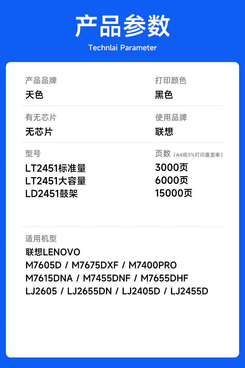 • 商品名称:天色适用联想m7605d硒鼓lt2451h粉盒m7675dxf m7400pro m7615dna LJ2655dn m7455dnf 7450F打印机墨盒 LT2451粉盒/个