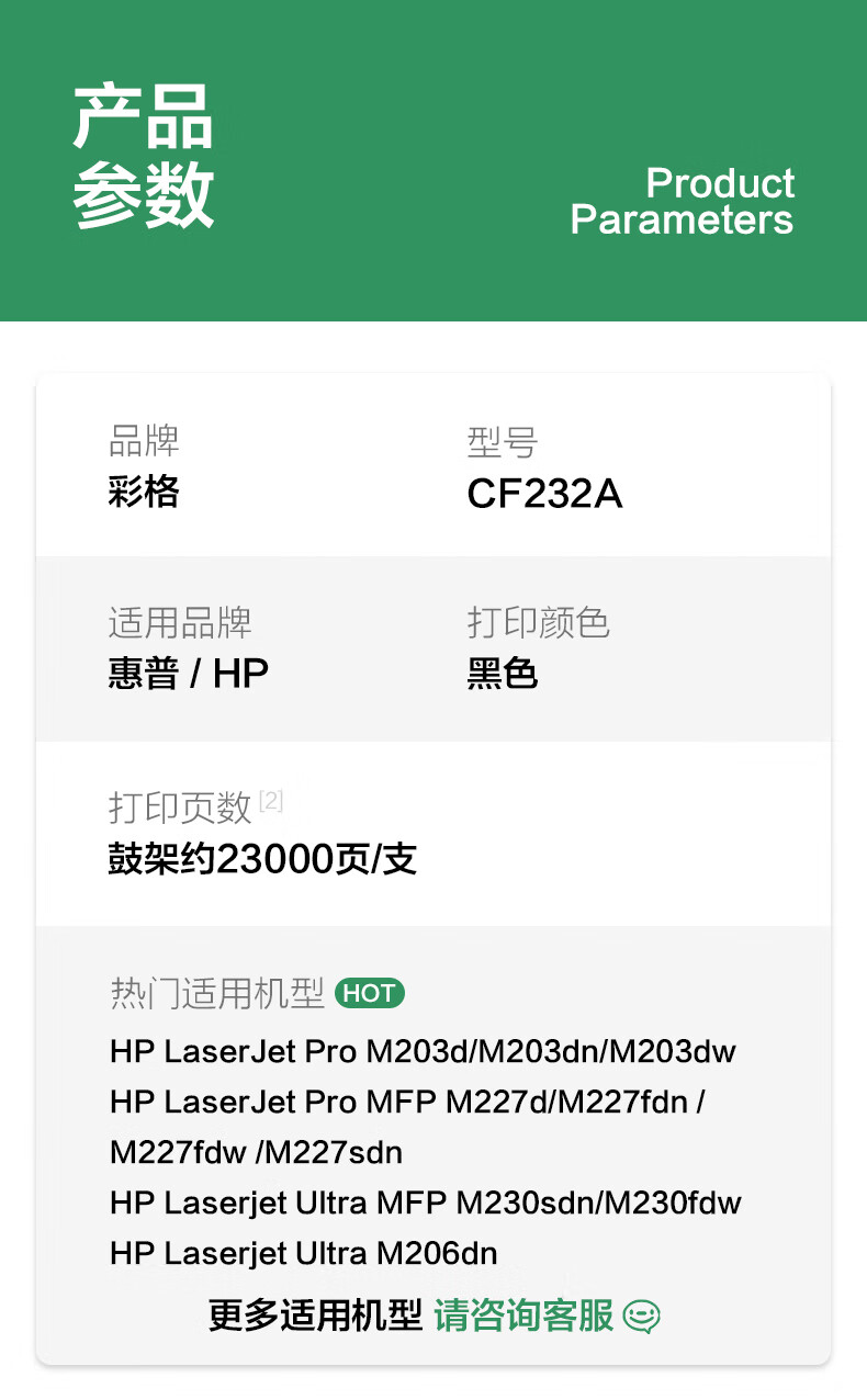 • 商品名称:彩格适用惠普cf232a成像鼓hp m227fdw m227d m227sdn m227fdn m203dw m203dn 30a 32a cf230a打印机硒鼓鼓架 CF232A硒鼓(带芯片)/支