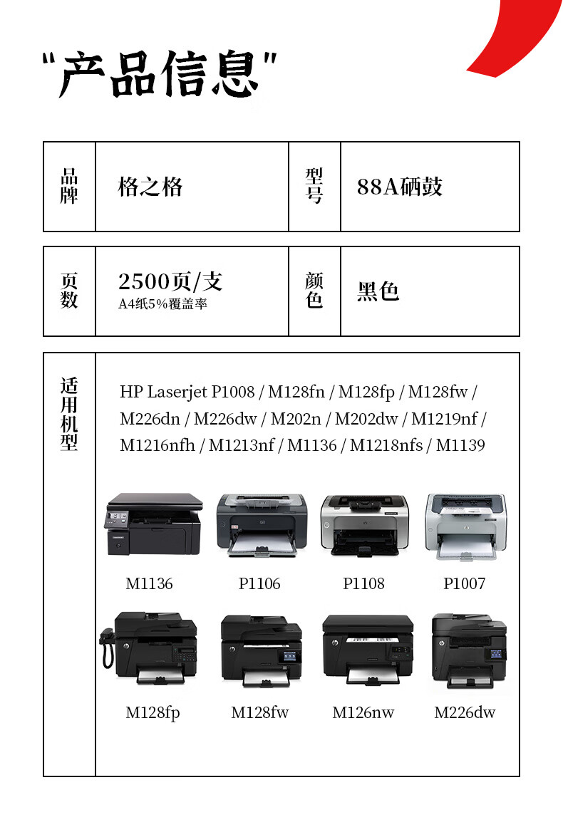 格之格388a硒鼓 88a硒鼓适用惠普m126a硒鼓 m1136硒鼓 1108硒鼓 m128fn p1007 p1008 p1106 m1139粉盒cc388a墨盒 NT-CNH388XCTF/个