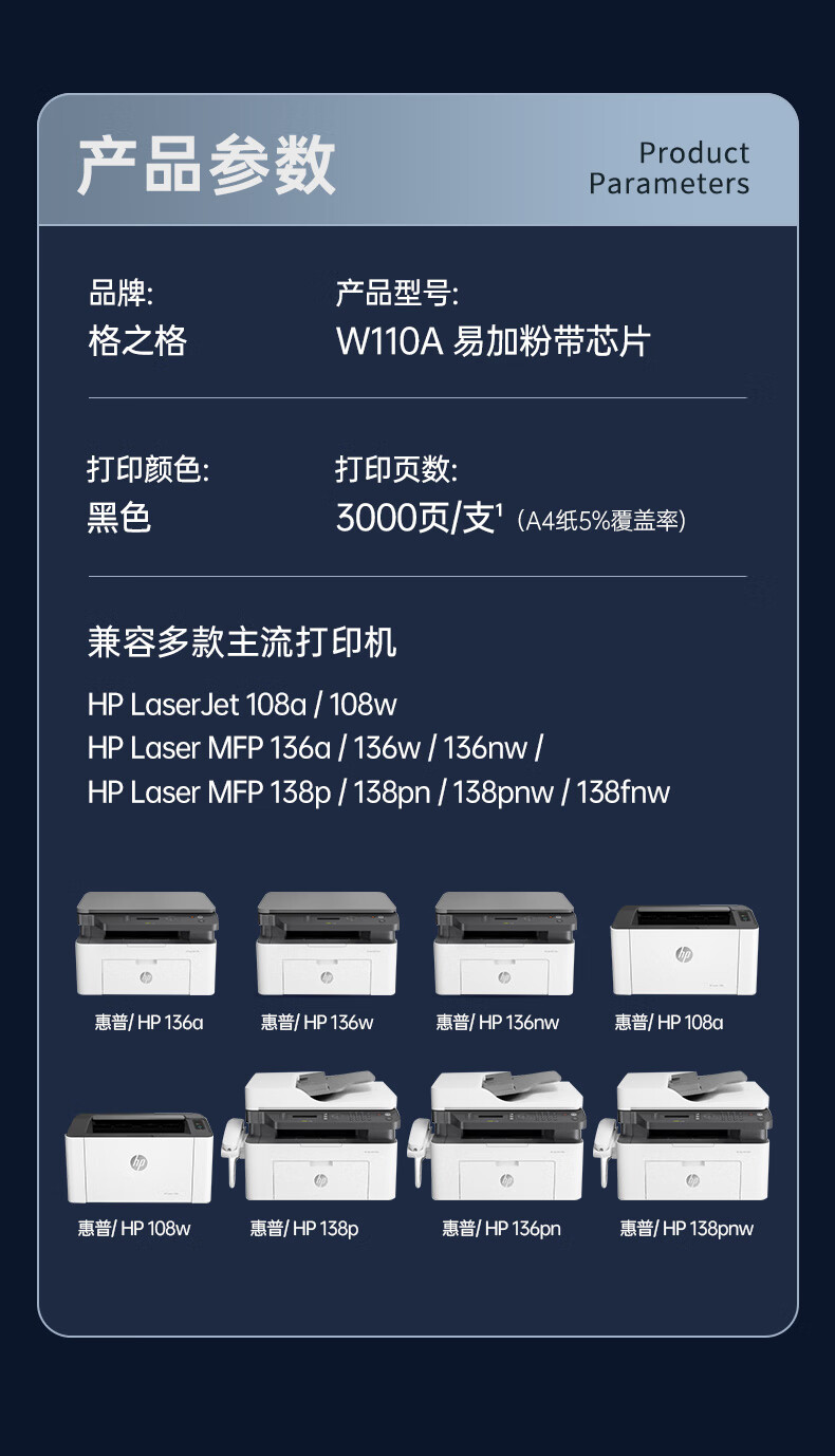 商品名称: 格之格110a硒鼓 惠普136w硒鼓适用hp136w硒鼓 136wm硒鼓 136a 136nw 108a 108w 138pn w1110a墨盒 3000页 黑色 单支 W1110A/盒