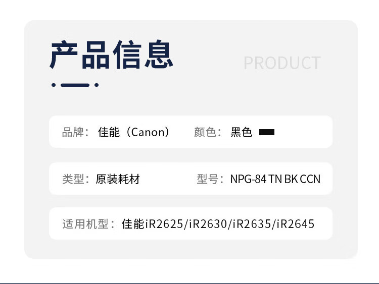 商品名称: 佳能(Canon)NPG-84原装大容量墨粉适用数码复合机iR2625/iR2630/iR2635/iR2645(打印量:30000) NPG-84 TN BK OTH/支