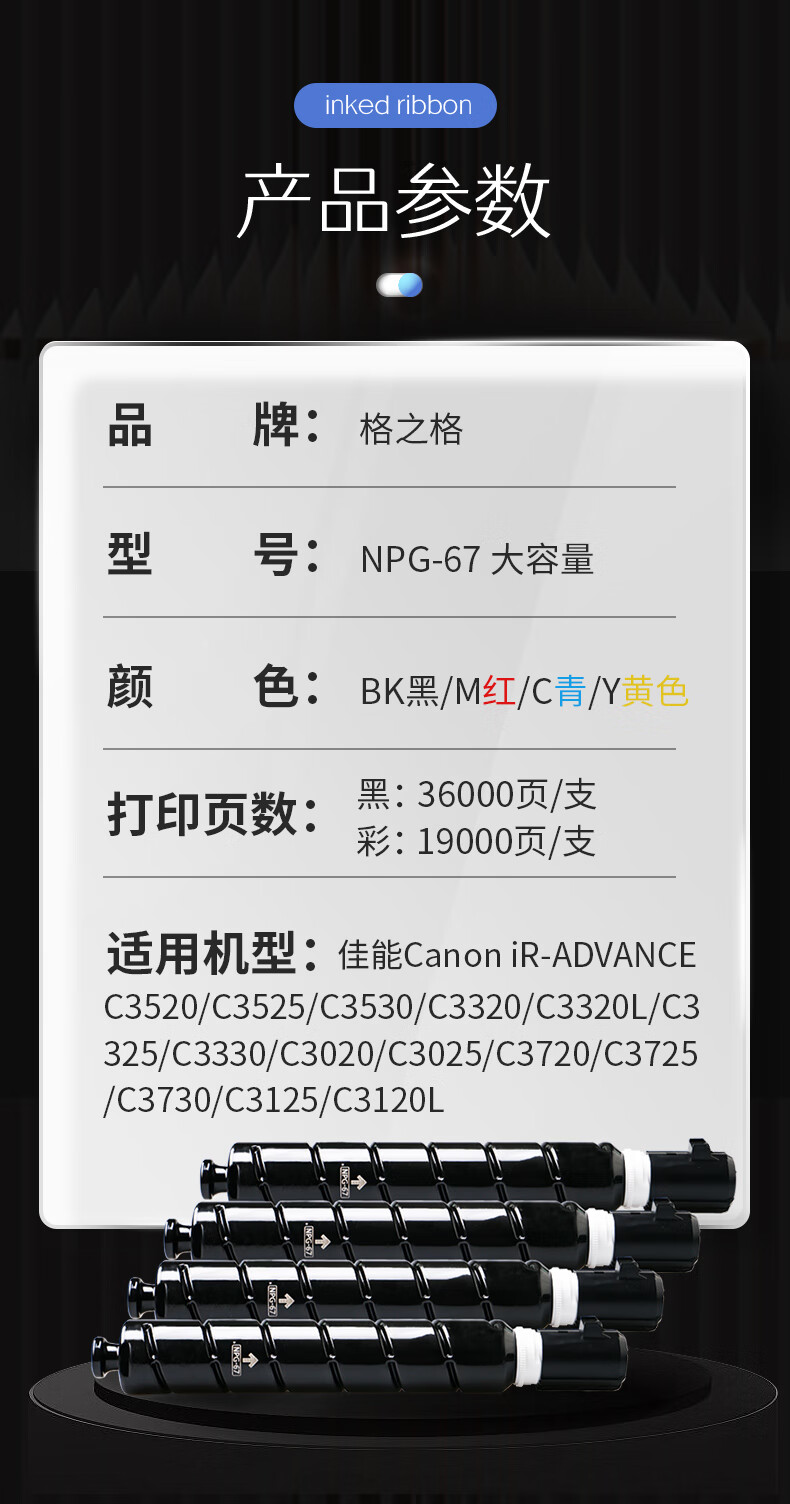 • 商品名称:格之格适用佳能NPG-67粉盒 C3222l墨盒C3020 3120L硒鼓3226 c3130l c3125 C3520粉盒C3325 NPG67四色高容套装 NT-CNC67XFA网络专供升级版四色套装/个