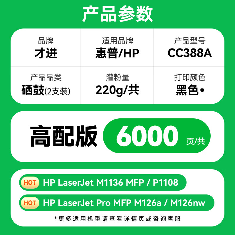 商品名称: 才进88a硒鼓适用惠普m1136硒鼓M126a/nw/snw plus打印机p1108 P1106 cc388a M128fn/fp/fw墨盒1007 1008 m1216nfh 高配版2支装-CC388A/支