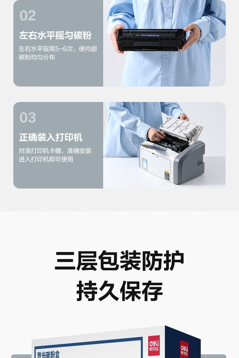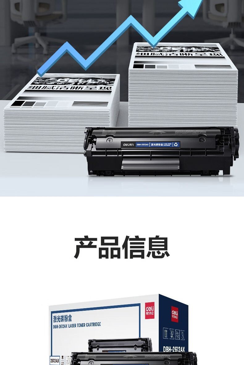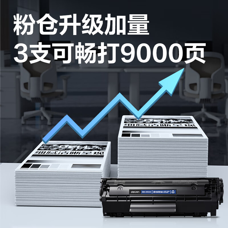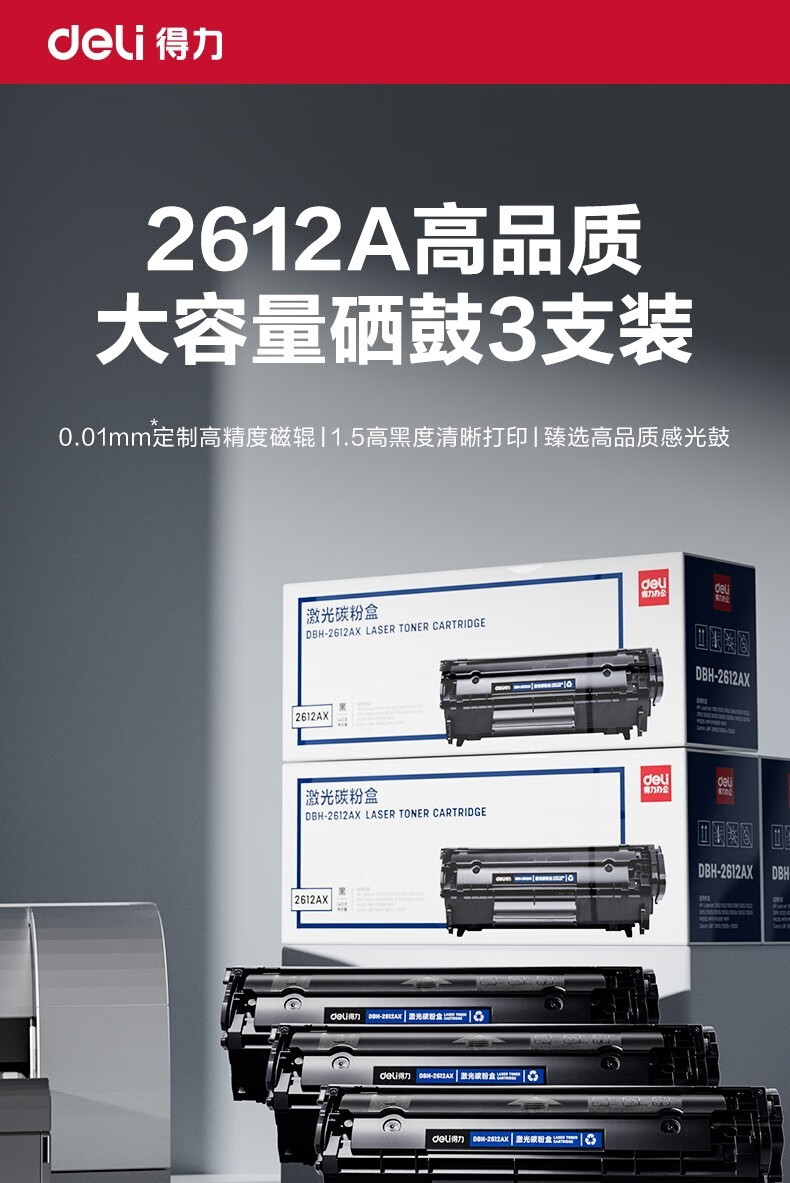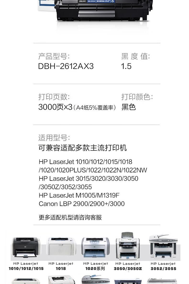 商品名称: 得力(deli)12a硒鼓 Q2612A硒鼓适用惠普1020硒鼓 hp m1005 1020plus 1010 佳能lbp2900打印机墨盒 大容量3支 DBH-2612AX3/盒