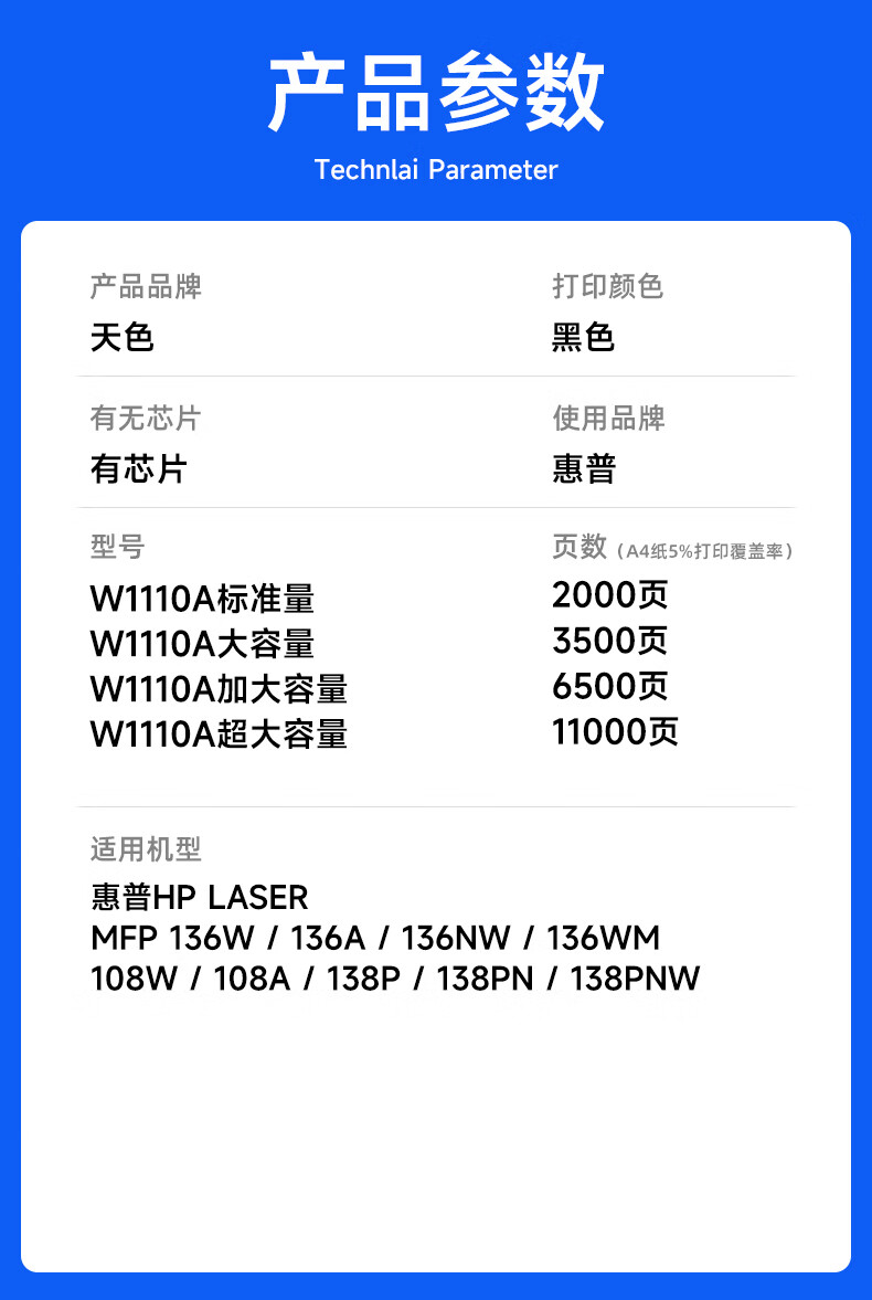 • 商品名称:天色110a硒鼓 惠普136w硒鼓适用hp136w硒鼓 136wm硒鼓 136a 136nw 108w 108a w1110a墨盒加大容量 110X 大容量 芯片版/个