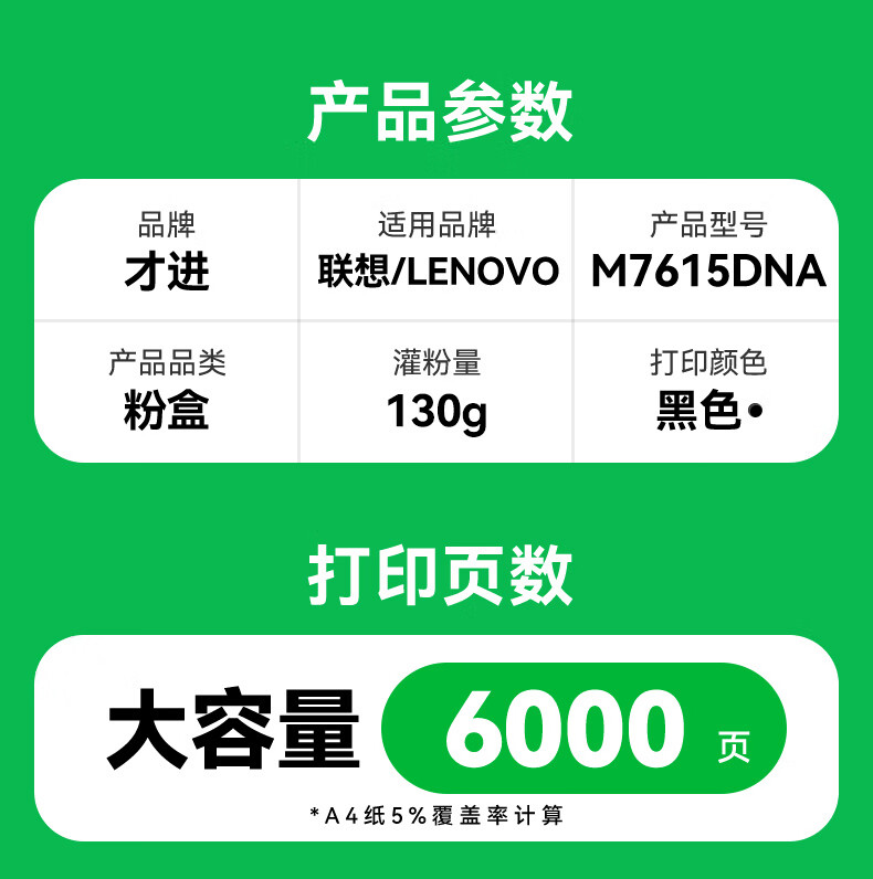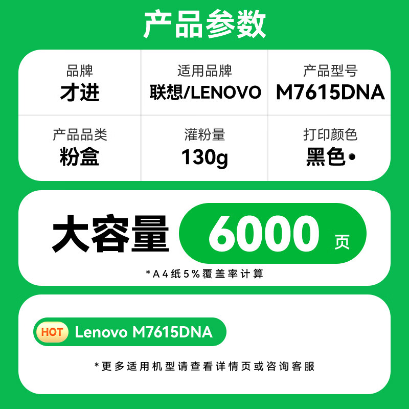 商品名称: 才进适用联想M7615DNA硒鼓m7615dna打印机粉盒易加粉墨盒鼓架套装晒鼓一体机激光多功能碳粉 联想7615dna粉盒 粉盒 M7615DNA 大容量版1支装/支