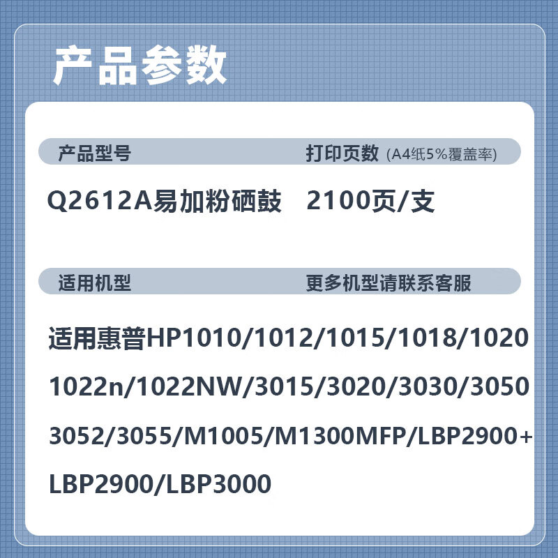 • 商品名称:映美佳 Q 2612A硒鼓易加粉 适用惠普M1005 hp1020 12A 硒鼓 1010 1015 1018 1022 m1319f lbp2900 打印机 Q2612A硒鼓易加粉/支